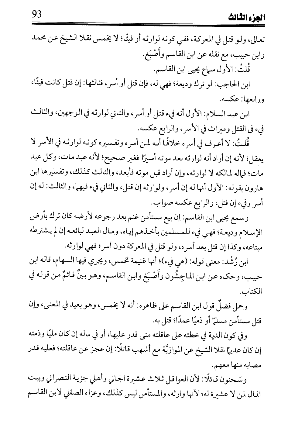ابن عبد السلام: الأول أنه فيء قتل أو أسر، والثاني لوارثه في الوجهين، والثالث فيء في القتل وميراث في الأسر، والرابع عكسه.