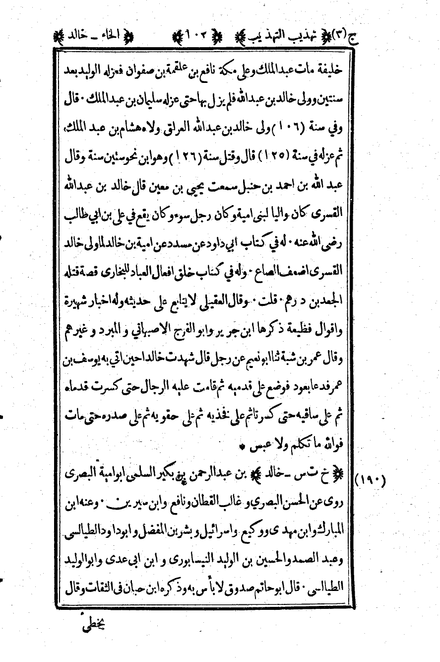 خليفة مات عبد الملك وعلى مكة نافع بن علقمة بن صفوان فعزله الوليد بعد سنتين وولي خالد بن عبد الله فلم يزل بها حتى عزله سليمان بن عبد الملك قال وفي سنة "106" ولي خالد بن عبد الله العراق ولاه هشام بن عبد الملك ثم عزله في سنة "125" قال وقتل سنة "136" وهو ابن نحو ستين وقال عبد الله بن أحمد بن حنبل سمعت يحيى بن معين قال خالد بن عبد الله القسري كان واليا لبني أمية وكان رجل سوء وكان يقع في علي بن أبي طالب رضي الله عنه له في كتاب أبي داود عن مسدد عن أمية بن خالد لما ولي خالد القسري أضعف الصاع وله في كتاب خلق أفعال العباد للبخاري قصة قتله الجعد بن درهم. قلت وقال العقيلي لا يتابع على حديثه وله أخبار شهيرة وأقوال فظيعة ذكرها بن جرير وأبو الفرج الأصبهاني والمبرد وغيرهم وقال عمر بن شبة ثنا أبو نعيم عن رجل قال شهدت خالدا حين أتى به يوسف بن عمر فدعا بعود فوضع على قدميه ثم قامت عليه الرجال حتى كسرت قدماه ثم على ساقيه حتى كسرت ثم على فخذيه ثم على حقويه ثم على صدره حتى مات فوالله ما تكلم ولا عبس.