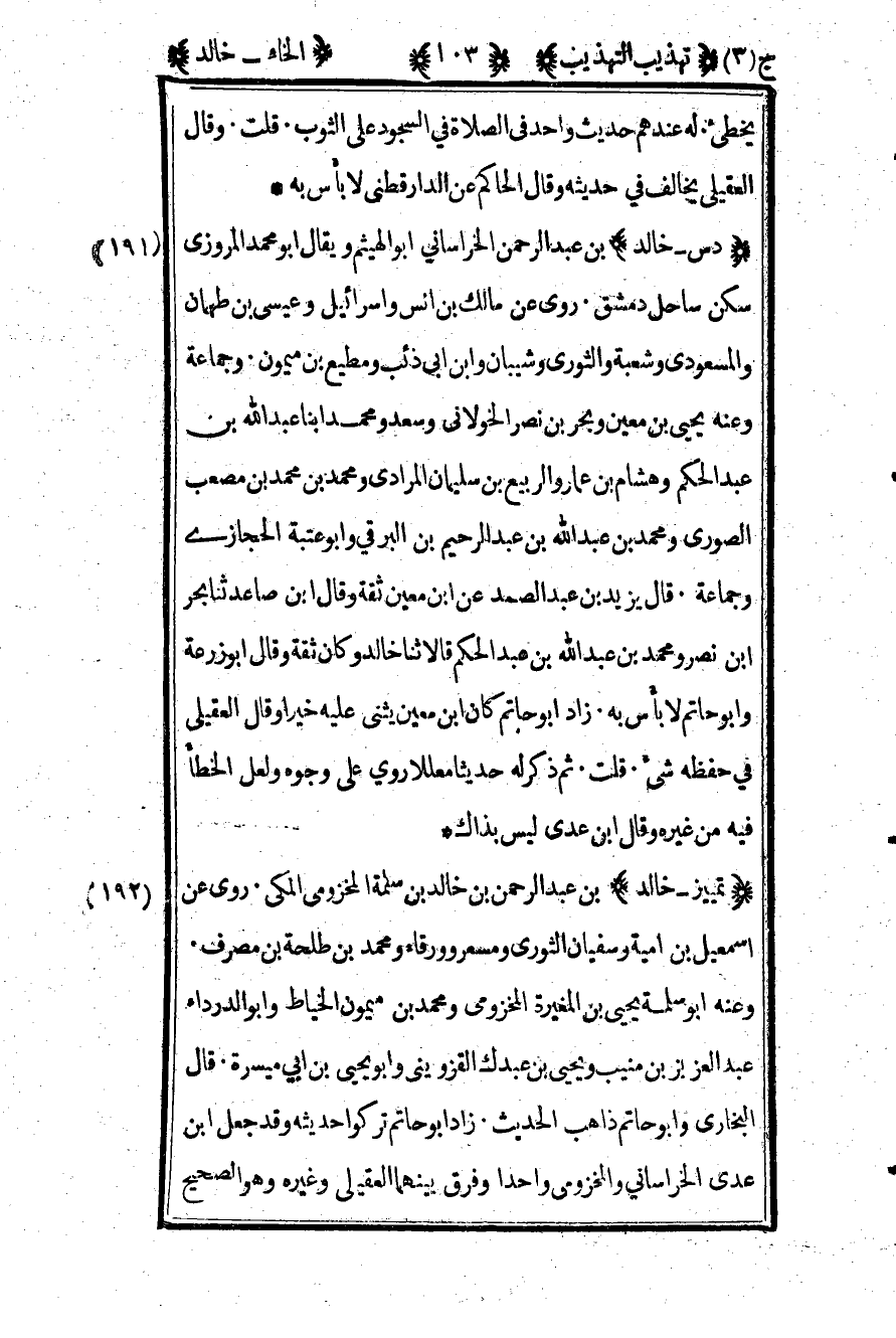 192- "تمييز - خالد" بن عبد الرحمن بن خالد بن سلمة المخزومي المكي. روى عن إسماعيل بن أمية وسفيان الثوري ومسعر وورقاء ومحمد بن طلحة بن مصرف وعنه أبو سلمة يحيى بن المغيرة المخزومي ومحمد بن ميمون الخياط وأبو الدرداء عبد العزيز بن منيب ويحيى بن عبدك القزويني وأبو يحيى بن أبي ميسرة قال البخاري وأبو حاتم ذاهب الحديث زاد أبو حاتم تركوا حديثه وقد جعل بن عدي الخراساني والمخزومي واحدا وفرق بينهما العقيلي وغيره وهو الصحيح