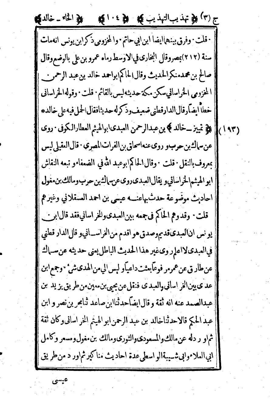 193- "تمييز - خالد" بن عبد الرحمن العبدي أبو الهيثم العطار الكوفي. روى عن سماك بن حرب وروى عنه إسحاق بن الفرات المصري قال العقيلي ليس بمعروف بالنقل. قلت وقال الحاكم أبو عبد الله في الضعفاء وتبعه النقاش أبو الهيثم الخراساني ويقال العبدي روى عن سماك بن حرب ومالك بن مغول أحاديث موضوعة حدث بها عنه عيسى بن أحمد العسقلاني وغيرهم قلت وقد وهم الحاكم في جمعه بين العبدي والخراساني فقد قال بن يونس إن العبدي قديم وصدق هو أقدم من الخراساني وقال الدارقطني في العبدي لا أعلم من روى غير هذا الحديث الباطل يعني حديثه عن سماك عن طارق عن عمر مرفوعا بعثت داعيا وليس إلي من الهدي شيء. وجمع بن عدي بين الخراساني والعبدي فنقل عن يحيى بن معين من طريق يزيد بن عبد الصمد عنه أنه ثقة وقال أيضا حدثنا بن صاعد ثنا بحر بن نصر وابن عبد الحكم قالا حدثنا خالد بن عبد الرحمن أبو الهيثم الخراساني وكان ثقة ثم أورد له عن مالك والمسعودي والثوري ومالك بن مغول ومسعر وكامل أبي العلاء وأبي شيبة الواسطي عدة أحاديث مناكير ثم أورده من طريق