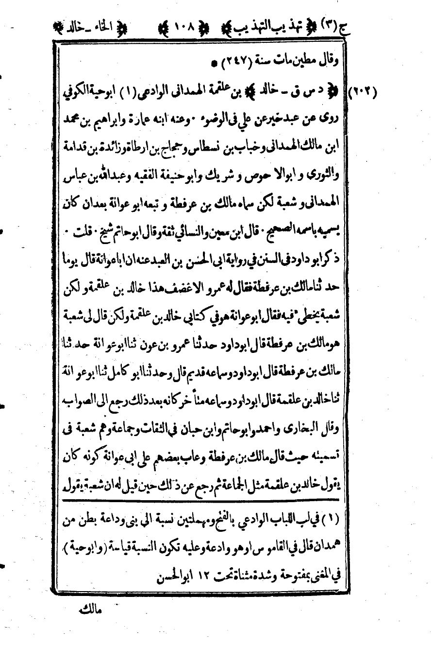 202- "د س ق - خالد" بن علقمة الهمداني الوادعي1 أبو حية الكوفي روى عن عبد خير عن علي في الوضوء وعنه ابنه عمارة وإبراهيم بن محمد بن مالك الهمداني وخباب بن نسطاس وحجاج بن أرطأة وزائدة بن قدامة والثوري وأبو الأحوص وشريك وأبو حنيفة الفقيه وعبد الله بن عباس الهمداني وشعبة لكن سماه مالك بن عرفطة وتبعه أبو عوانة بعد أن كان يسميه باسمه الصحيح قال بن معين والنسائي ثقة وقال أبو حاتم شيخ قلت ذكر أبو داود في السنن في رواية أبي الحسن بن العبد عنه أن أبا عوانة قال يوما حدثنا مالك بن عرفطة فقال له عمرو الأغضف هذا خالد بن علقمة ولكن شعبة يخطىء فيه فقال أبو عوانة هو في كتابي خالد بن علقمة ولكن قال لي شعبة هو مالك بن عرفطة قال أبو داود حدثنا عمرو بن عون ثنا أبو عوانة حدثنا مالك بن عرفطة قال أبو داود وسماعه قديم قال وحدثنا أبو كامل ثنا أبو عوانة ثنا خالد بن علقمة قال أبو داود وسماعه متأخر كأنه بعد ذلك رجع إلى الصواب وقال البخاري وأحمد وأبو حاتم وابن حبان في الثقات وجماعة وهم شعبة في تسميته حيث قال مالك بن عرفطة وعاب بعضهم على أبي عوانة كونه كان يقول خالد بن علقمة مثل الجماعة ثم رجع عن ذلك حيث قيل له إن شعبة يقول.