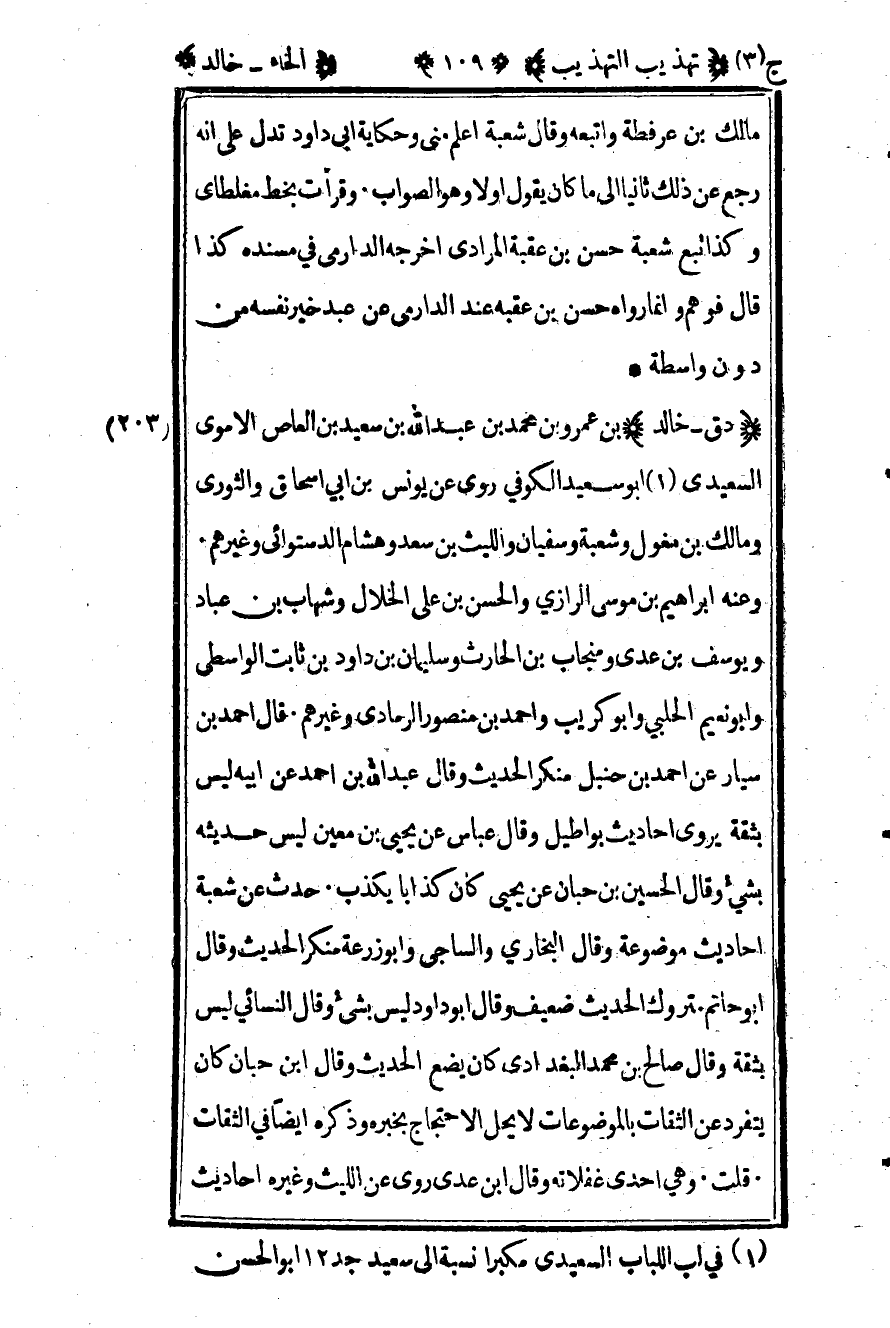 203- "دق - خالد" بن عمرو بن محمد بن عبد الله بن سعيد بن العاص الأموي السعيدي1 أبو سعيد الكوفي روى عن يونس بن أبي إسحاق والثوري ومالك بن مغول وشعبة وسفيان والليث بن سعد وهشام. الدستوائي وغيرهم وعنه إبراهيم بن موسى الرازي والحسن بن علي الخلال وشهاب بن عباد ويوسف بن عدي ومنجاب بن الحارث وسليمان بن داود بن ثابت الواسطي وأبو نعيم الحلبي وأبو كريب وأحمد بن منصور الرمادي وغيرهم. قال أحمد بن سيار عن أحمد بن حنبل منكر الحديث وقال عبد الله بن أحمد عن أبيه ليس بثقة يروي أحاديث بواطيل وقال عباس عن يحيى بن معين ليس حديثه بشيء وقال الحسين بن حبان عن يحيى كان كذابا يكذب حدث عن شعبة أحاديث موضوعة وقال البخاري والساجي وأبو زرعة منكر الحديث وقال أبو حاتم متروك الحديث ضعيف وقال أبو داود ليس بشيء وقال النسائي ليس بثقة وقال صالح بن محمد البغدادي كان يضع الحديث وقال ابن حبان كان يتفرد عن الثقات بالموضوعات لا يحل الاحتجاج بخبره وذكره أيضا في الثقات قلت وهي إحدى غفلاته وقال ابن عدي روى عن الليث وغيره أحاديث