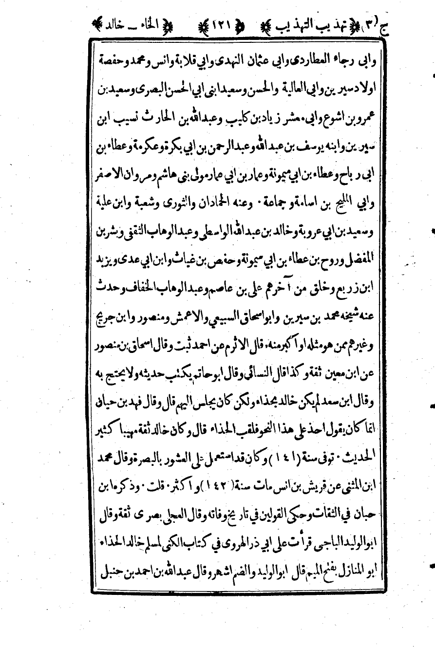 وأبي رجاء العطاردي وأبي عثمان النهدي وأبي قلابة وأنس ومحمد وحفصة أولاد سيرين وأبي العالية والحسن وسعيد ابني أبي الحسن البصري وسعيد بن عمرو بن أشوع وأبي معشر زياد بن كليب وعبد الله بن الحارث نسيب بن سيرين وابنه يوسف بن عبد الله وعبد الرحمن بن أبي بكرة وعكرمة وعطاء بن أبي رباح وعطاء بن أبي ميمونة وعمار بن أبي عمار مولى بني هاشم ومروان الأصفر وأبي المليح بن أسامة وجماعة. وعنه الحمادان والثوري وشعبة وابن علية وسعيد بن أبي عروبة وخالد بن عبد الله الواسطي وعبد الوهاب الثقفي وبشر بن المفضل وروح بن عطاء بن أبي ميمونة وحفص بن غياث وابن أبي عدي ويزيد بن زريع وخلق من آخرهم علي بن عاصم وعبد الوهاب الخفاف وحدث عنه شيخه محمد بن سيرين وأبو إسحاق السبيعي والأعمش ومنصور وابن جريج وغيرهم ممن هو مثله أو أكبر منه قال الأثرم عن أحمد ثبت وقال إسحاق بن منصور عن ابن معين ثقة وكذا قال النسائي وقال أبو حاتم يكتب حديثه ولا يحتج به وقال ابن سعد لم يكن خالد بحذاء ولكن كان يجلس إليهم قال وقال فهد بن حبان إنما كان يقول أحذ على هذا النحو فلقب الحذاء قال وكان خالد ثقة مهيبا كثير الحديث توفي سنة "141" وكان قد استعمل على العشور بالبصرة وقال محمد بن المثنى عن قريش بن أنس مات سنة "142" وأكثر. قلت وذكره ابن حبان في الثقات وحكى القولين في تاريخ وفاته وقال العجلي بصري ثقة وقال أبو الوليد الباجي قرأت على أبي ذر الهروي في كتاب الكنى لمسلم خالد الحذاء أبو المنازل بفتح الميم قال أبو الوليد والضم أشهر وقال عبد الله بن أحمد بن حنبل