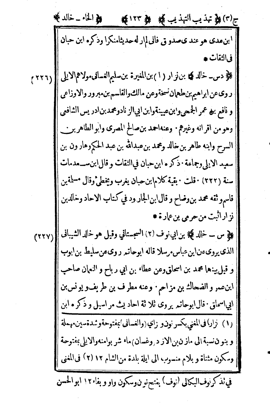 226- "د س - خالد" بن نزار1 بن المغيرة بن سليم الغساني مولاهم الأيلي روى عن إبراهيم بن طهمان نسخة وعن مالك والقاسم بن مبرور والأوزاعي ونافع بن عمر الجمحي وابن عيينة وابن أبي الزناد ومحمد بن إدريس الشافعي وهو من أقرانه وغيرهم. وعنه أحمد بن صالح المصري وأبو الطاهر بن السرح وابنه طاهر بن خالد ومحمد بن عبد الله بن عبد الحكم وهارون بن سعيد الأيلي وجماعة. ذكره ابن حبان في الثقات وقال ابن سعد مات سنة "222". قلت بقية كلام بن حبان يغرب ويخطىء وقال مسلمة بن قاسم وثقه محمد بن وضاح وقال ابن الجارود في كتاب الآحاد وخالد بن نزار أثبت من حرمي بن عمارة.