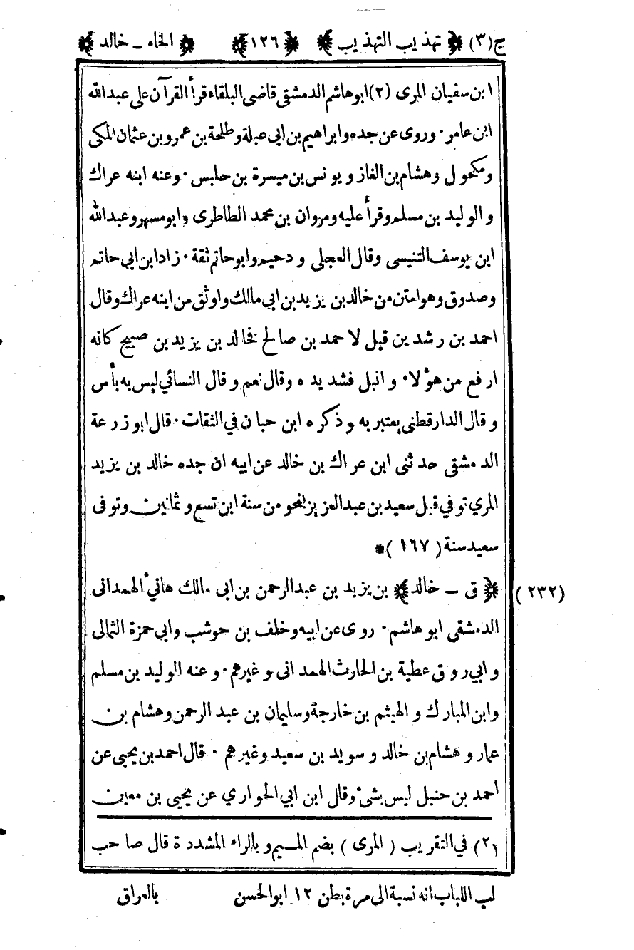 232- "ق - خالد" بن يزيد بن عبد الرحمن بن أبي مالك هانئ الهمداني الدمشقي أبو هاشم. روى عن أبيه وخلف بن حوشب وأبي حمزة الثمالي وأبي روق عطية بن الحارث الهمداني وغيرهم. وعنه الوليد بن مسلم وابن المبارك والهيثم بن خارجة وسليمان بن عبد الرحمن وهشام بن عمار وهشام بن خالد وسويد بن سعيد وغيرهم قال أحمد بن يحيى عن أحمد بن حنبل ليس بشيء وقال ابن أبي الحواري عن يحيى بن معين