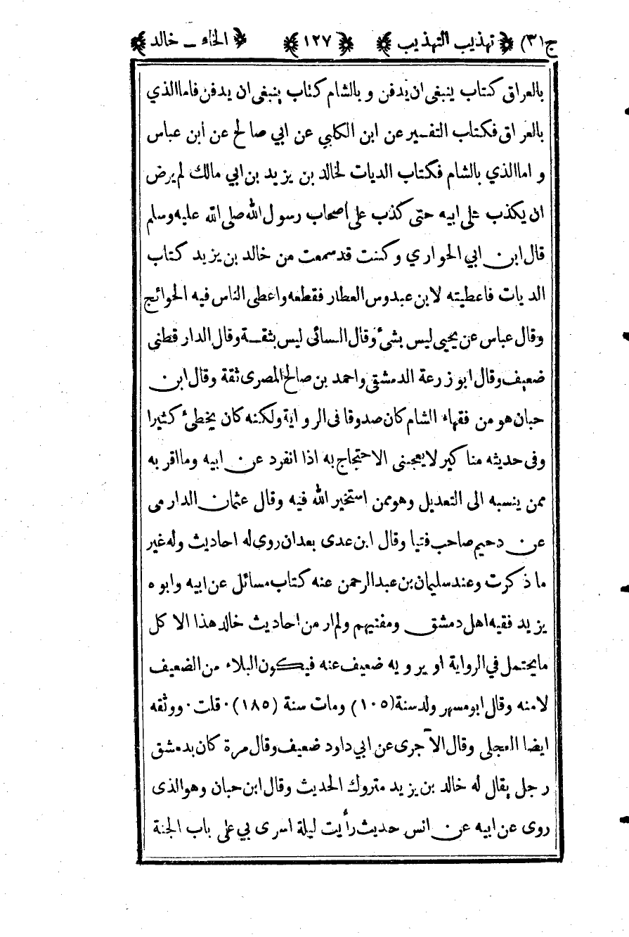 بالعراق كتاب ينبغي أن يدفن وبالشام كتاب ينبغي أن يدفن فأما الذي بالعراق فكتاب التفسير عن ابن الكلبي عن أبي صالح عن ابن عباس وأمام الذي بالشام فكتاب الديات لخالد بن يزيد بن أبي مالك لم يرض أن يكذب على أبيه حتى كذب على أصحاب رسول الله صلى الله عليه وسلم قال بن أبي الحواري وكنت قد سمعت من خالد بن يزيد كتاب الديات فأعطيته لابن عبدوس العطار فقطعه وأعطى الناس فيه الحوائج وقال عباس عن يحيى ليس بشيء وقال النسائي ليس بثقه وقال الدارقطني ضعيف وقال أبو زرعة الدمشقي وأحمد بن صالح المصري ثقة وقال ابن حبان هو من فقهاء الشام كان صدوقا في الرواية ولكنه كان يخطىء كثيرا وفي حديثه مناكير لا يعجبني الاحتجاج به إذا انفرد عن أبيه وما أقر به ممن ينسب إلى التعديل وهو ممن استخير الله فيه وقال عثمان الدارمي عن دحيم صاحب فتيا وقال ابن عدي بعد أن روى له أحاديث وله غير ما ذكرت وعند سليمان بن عبد الرحمن عنه كتاب مسائل عن أبيه وأبوه يزيد فقيه أهل دمشق ومفتيهم ولم أر من أحاديث خالد هذا إلا كل ما يحتمل في الرواية أو يرويه ضعيف عنه فيكون البلاء من الضعيف لا منه وقال أبو مسهر ولد سنة "105" ومات سنة "185". قلت ووثقه أيضا العجلي وقال الآجري عن أبي داود ضعيف وقال مرة كان بدمشق رجل يقال له خالد بن يزيد متروك الحديث وقال ابن حبان وهو الذي روى عن أبيه عن أنس حديث رأيت ليلة أسرى بي على باب الجنة