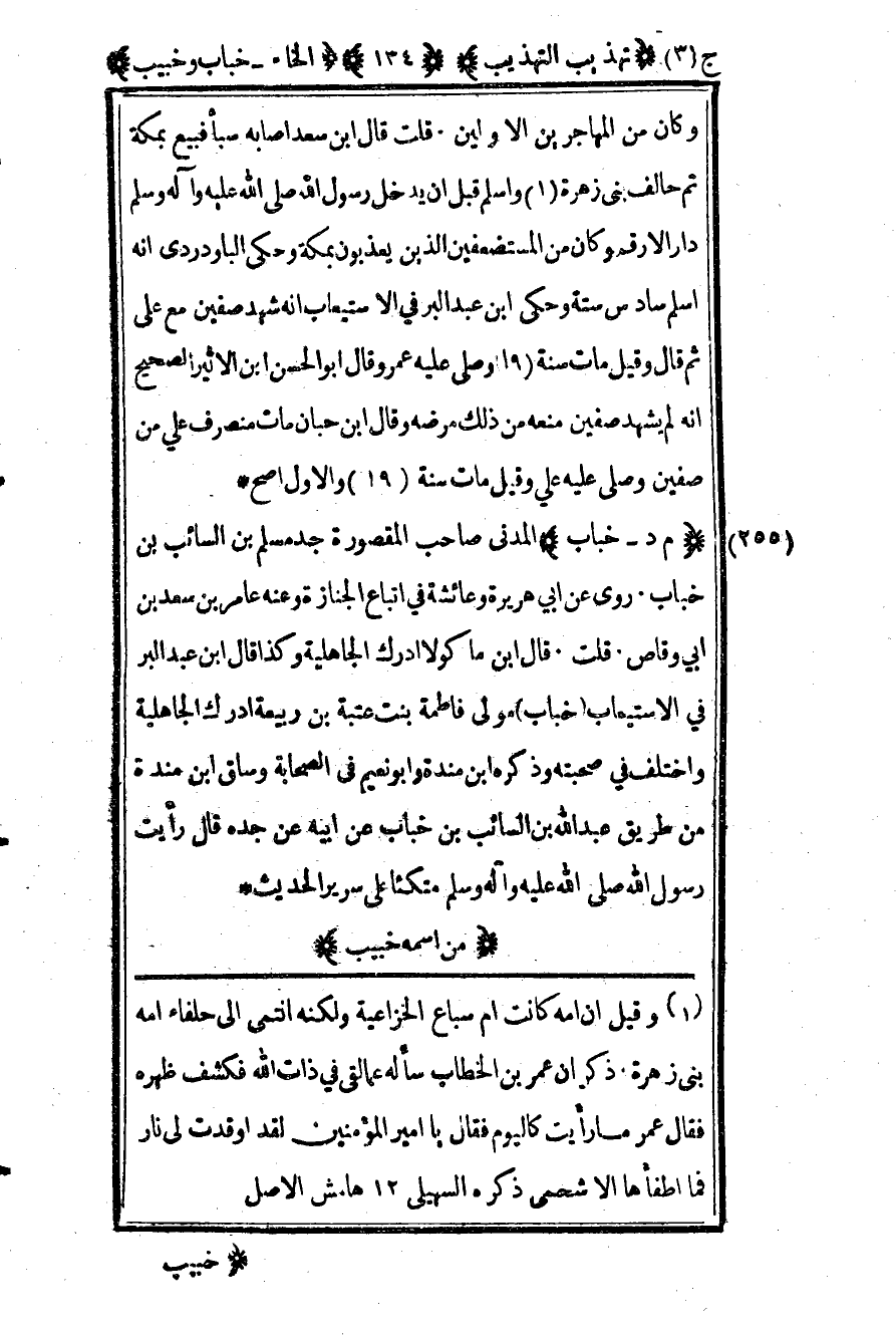 255- "م د - خباب" المدني صاحب المقصورة جد مسلم بن السائب بن خباب. روى عن أبي هريرة وعائشة في أتباع الجنازة وعنه عامر بن سعد بن أبي وقاص قلت قال بن ماكولا أدرك الجاهلية وكذا قال بن عبد البر في الاستيعاب "خباب" مولى فاطمة بنت عتبة بن ربيعة أدرك الجاهلية واختلف في صحبته وذكره ابن منده وأبو نعيم في الصحابة وساق بن منده من طريق عبد الله بن السائب بن خباب عن أبيه عن جده قال رأيت رسول الله صلى الله عليه وسلم متكئا على سرير الحديث.