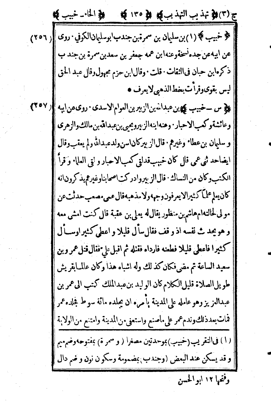 1 في التقريب "خبيب" بموحدتين مصغرا "وسمرة" بمفتوحة وضم ميم وقد يسكن عند البعض "وجندب" بمضمومة وسكون نون وضم دال وفتحها 12 أبو الحسن.