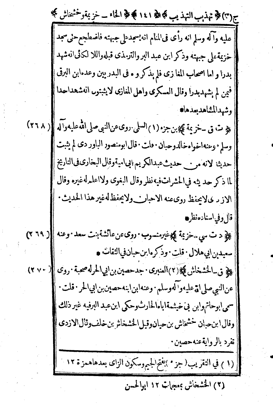 268- "ت ق - خزيمة" بن جزء1 السلمي روى عن النبي صلى الله عليه وآله وسلم وعنه أخواه خالد وحبان. قلت قال أبو منصور الباوردي لم يثبت حديثه لأنه من حديث عبد الكريم أبي أمية وقال البخاري في التاريخ لما ذكر حديثه في الحشرات فيه نظر وقال البغوي ولا أعلم له غيره وقال الأزدي لا يحفظ من روى عنه إلا حبان ولا يحفظ له هذا الحديث. قال وفي إسناده نظر.