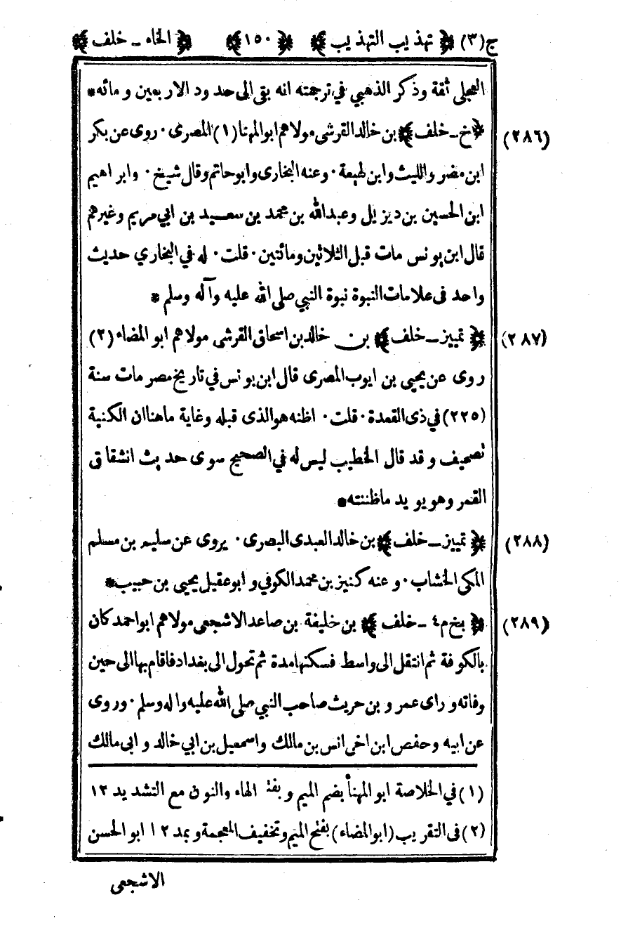 286- "خ - خلف" بن خالد القرشي مولاهم أبو المهنا1 المصري. روى عن بكر بن مضر والليث وابن لهيعة وعنه البخاري وأبو حاتم وقال شيخ وإبراهيم بن الحسين بن ديزيل وعبد الله بن محمد بن سعيد بن أبي مريم وغيرهم قال بن يونس مات قبل الثلاثين ومائتين قلت له في البخاري حديث واحد في علامات النبوة نبوة النبي صلى الله عليه وسلم.