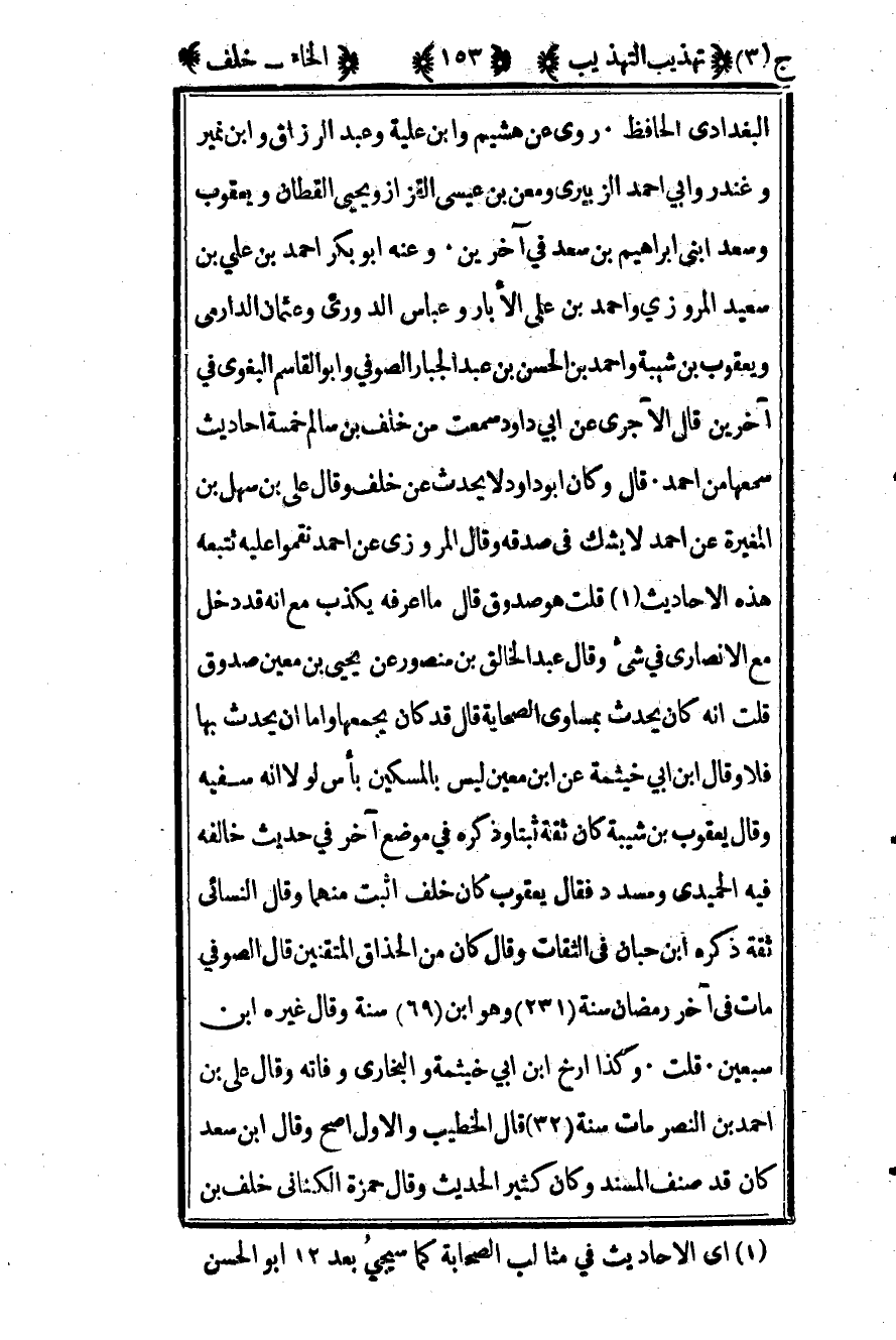 البغدادي الحافظ. روى عن هشيم وابن عليه وعبد الرزاق وابن نمير وغندر وأبي أحمد الزبيري ومعن ابن عيسى القزاز ويحيى القطان ويعقوب وسعد ابني إبراهيم بن سعد في آخرين. وعنه أبو بكر أحمد بن علي بن سعيد المروزي وأحمد بن علي الأبار وعباس الدوري وعثمان الدارمي ويعقوب بن شيبة وأحمد بن الحسن بن عبد الجبار الصوفي وأبو القاسم البغوي في آخرين قال الآجري عن أبي داود سمعت من خلف بن سالم خمسة أحاديث سمعها من أحمد. قال وكان أبو داود لا يحدث عن خلف وقال علي بن سهل بن المغيرة عن أحمد لا يشك في صدقه وقال المروزي عن أحمد نقموا عليه تتبعه هذه الأحاديث1 قلت هو صدوق قال ما أعرفه يكذب مع أنه قد دخل مع الأنصاري في شيء وقال عبد الخالق بن منصور عن يحيى بن معين صدوق قلت أنه كان يحدث بمساوىء الصحابة قال قد كان يجمعها وأما أن يحدث بها فلا وقال ابن أبي خيثمة عن أبن معين ليس بالمسكين بأس لولا أنه سفيه وقال يعقوب بن شيبه كان ثقة ثبتا وذكره في موضع آخر في حديث خالفه فيه الحميدي ومسدد فقال يعقوب كان خلف أثبت منهما وقال النسائي ثقة ذكره ابن حبان في الثقات وقال كان من الحذاق المتقنين قال الصوفي مات في آخر رمضان سنة "231" وهو ابن "69" سنة وقال غيره بن سبعين قلت وكذا أرخ بن أبي خيثمة والبخاري وفاته وقال علي بن أحمد بن النصر مات سنة "32" قال الخطيب والأول أصح وقال ابن سعد كان قد صنف المسند وكان كثير الحديث وقال حمزة الكناني خلف بن