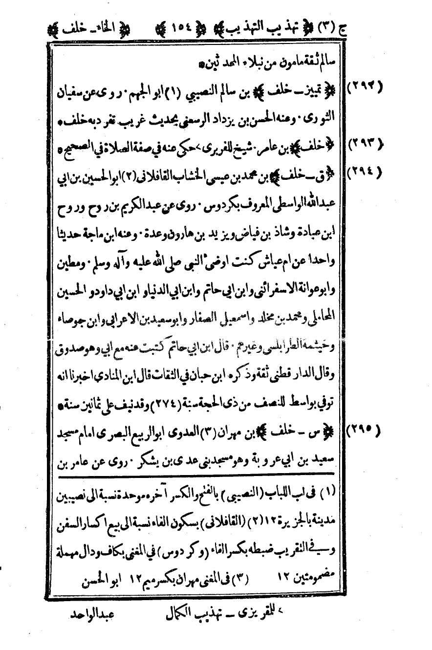 292- "تمييز - خلف" بن سالم النصيبي1 أبو الجهم. روى عن سفيان الثوري وعنه الحسن بن يزداد الرسعني بحديث غريب تفرد به خلف.