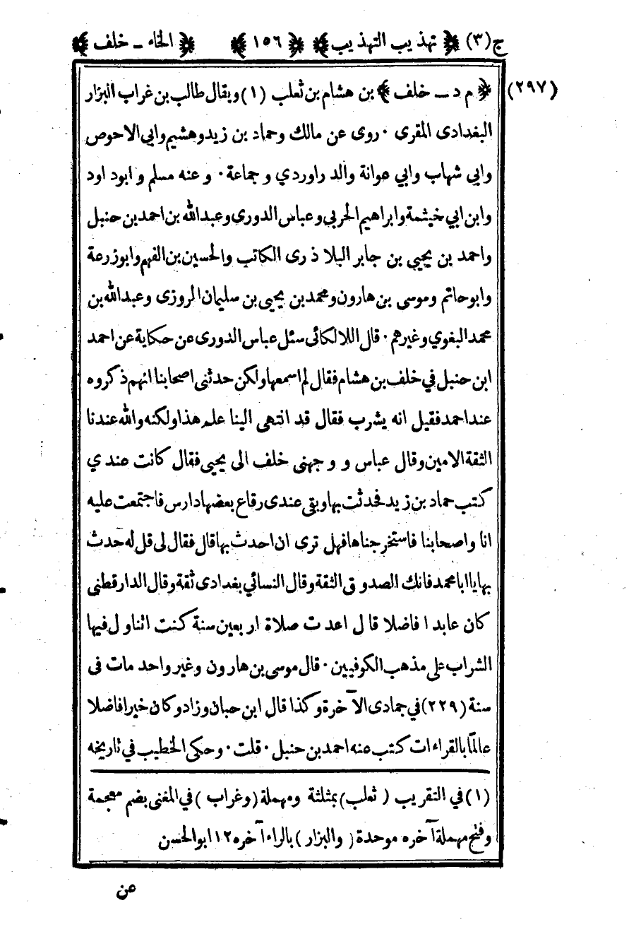 297- "م د - خلف" بن هشام بن ثعلب1 ويقال طالب بن غراب البزار البغدادي المقري روى عن مالك وحماد بن زيد وهشيم وأبي الأحوص وأبي شهاب وأبي عوانة والدراوري وجماعة. وعنه مسلم وأبو داود وابن أبي خيثمة وإبراهيم الحربي وعباس الدوري وعبد الله بن أحمد بن حنبل وأحمد بن يحيى بن جابر البلاذري الكاتب والحسين بن الفهم وأبو زرعة وأبو حاتم وموسى بن هارون ومحمد بن يحيى بن سليمان الروزي وعبد الله بن محمد البغوي وغيرهم. قال اللالكائي سئل عباس الدوري عن حكاية عن أحمد بن حنبل في خلف بن هشام فقال لم أسمعها ولكن حدثني أصحابنا إنهم ذكروه عند أحمد فقيل إنه يشرب فقال قد انتهى إلينا علم هذا ولكنه والله عندنا الثقة الأمين وقال عباس ووجهني خلف إلى يحيى فقال كانت عندي كتب حماد بن زيد فحدثت بها وبقي عندي رقاع بعضها دارس فاجتمعت عليه أنا وأصحابنا فاستخرجناها فهل ترى أن أحدث بها قال لي قل له حدث بها يا أبا محمد فإنك صدوق الثقة وقال النسائي بغدادي ثقة وقال الدارقطني كان عابدا فاضلا قال أعدت صلاة أربعين سنة كنت أتناول فيها الشراب على مذهب الكوفيين قال موسى بن هارون وغير واحد مات في سنة "229" في جمادى الآخرة وكذا قال بن حبان وزاد وكان خيرا فاضلا عالما بالقراءات كتب عنه أحمد بن حنبل. قلت وحكى الخطيب في تاريخه