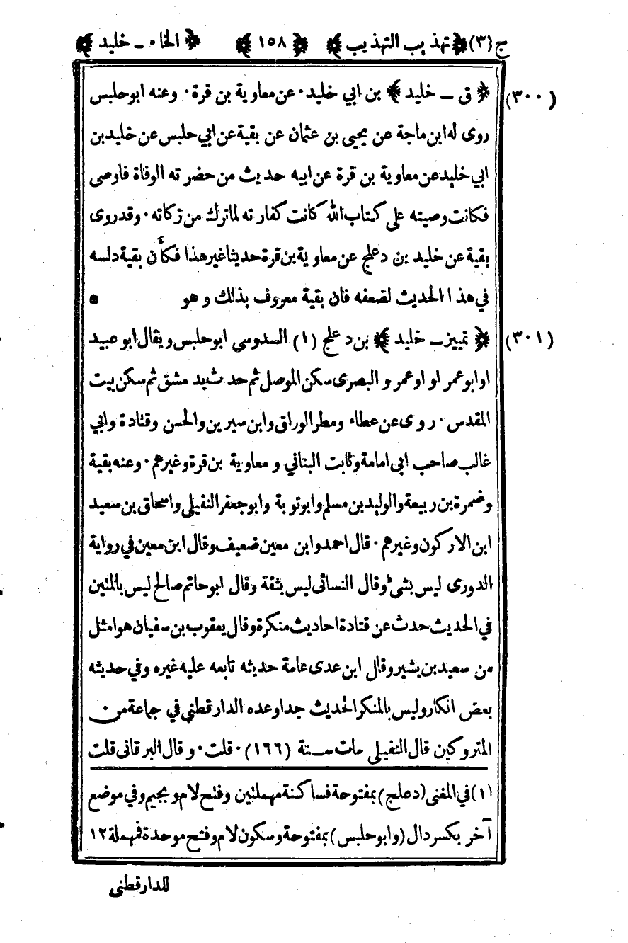 300- "ق - خليد" بن أبي خليد. عن معاوية بن قرة. وعنه أبو حلبس روى له ابن ماجة عن يحيى بن عثمان عن بقية عن أبي حلبس عن خليد بن أبي خليد عن معاوية بن قرة عن أبيه حديث من حضرته الوفاة فأوصى فكانت وصيته على كتاب الله كانت كفارته لما ترك من زكاته وقد روى بقية عن خليد بن دعلج عن معاوية بن قرة حديثا غير هذا فكأن بقية دلسه في هذا الحديث لضعفه فإن بقية معروف بذلك وهو.