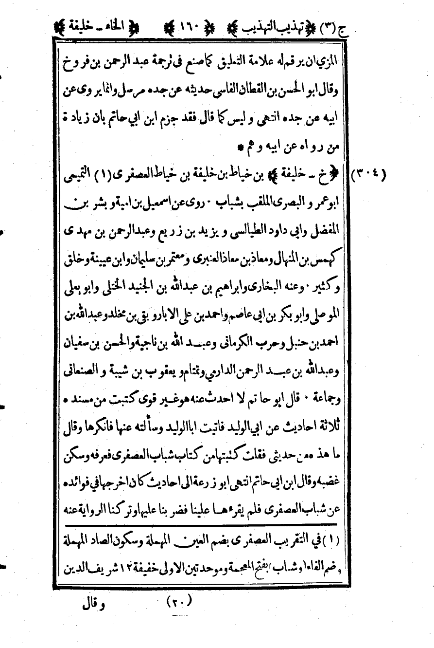 304- "خ - خليفة" بن خياط بن خليفة بن خياط العصفري1 التميمي أبو عمرو البصري الملقب بشباب. روى عن إسماعيل بن أمية وبشر بن المفضل وأبي داود الطيالسي ويزيد بن زريع وعبد الرحمن بن مهدي كهمس بن المنهال ومعاذ بن معاذ العنبري ومعتمر بن سليمان وابن عيينة وخلق وكثير وعنه البخاري وإبراهيم بن عبد الله بن الجنيد الختلي وأبو يعلى الموصلي وأبو بكر بن أبي عاصم وأحمد بن علي الأبار وبقي بن مخلد وعبد الله بن أحمد بن حنبل وحرب الكرماني وعبد الله بن ناجية والحسن بن سفيان وعبد الله بن عبد الرحمن الدارمي وعتام ويعقوب بن شيبة والصنعاني وجماعة قال أبو حاتم لا أحدث عنه هو غير قوي كتبت من مسنده. ثلاثة أحاديث عن أبي الوليد فأتيت أبا الوليد وسألته عنها فأنكرها وقال ما هذه من حديثي فقلت كتبتها من كتاب شباب العصفري فعرفه وسكن غضبه وقال ابن أبي حاتم انتهى أبو زرعة إلى أحاديث كان أخرجها في فوائده عن شباب العصفري فلم يقرأها علينا فضربنا عليها وتركنا الرواية عنه