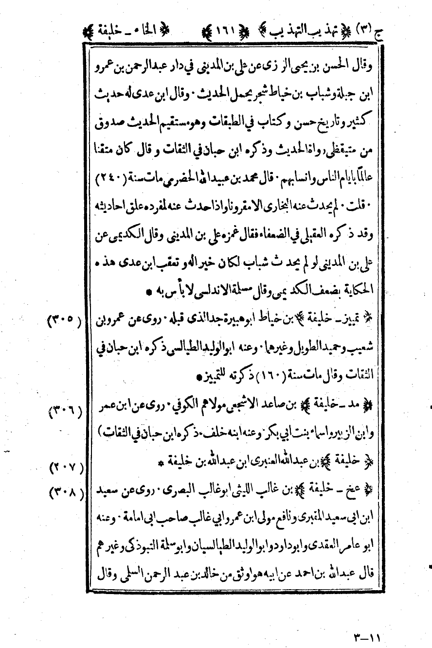 305- "تمييز - خليفة" بن خياط أبو هبيرة جد الذي قبله. روى عن عمرو بن شعيب وحميد الطويل وغيرهما. وعنه أبو الوليد الطيالسي ذكره ابن حبان في الثقات وقال مات سنة "160" ذكرته للتمييز.