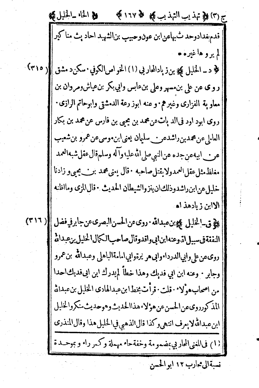 315- "د - الخليل" بن زياد المحاربي1 الخواص الكوفي سكن دمشق روى عن علي بن مسهر وعلي بن عابس وأبي بكر بن عياش ومروان بن معاوية الفزاري وغيرهم. وعنه أبو زرعة الدمشقي وأبو حاتم الرازي روى أبو داود في الديات عن محمد بن يحيى بن فارس عن محمد بن بكار العاملي عن محمد بن راشد عن سليمان يعني ابن موسى عن عمرو بن شعيب عن أبيه عن جده عن النبي صلى الله عليه وسلم قال: "عقل شبه العمد مغلظ مثل عقل العمد ولا يقتل صاحبه". قال يعني محمد بن يحيى وزادنا خليل عن ابن راشد وذلك أن ينزو الشيطان الحديث. قال المزي وما أظنه إلا بن زياد هذا.