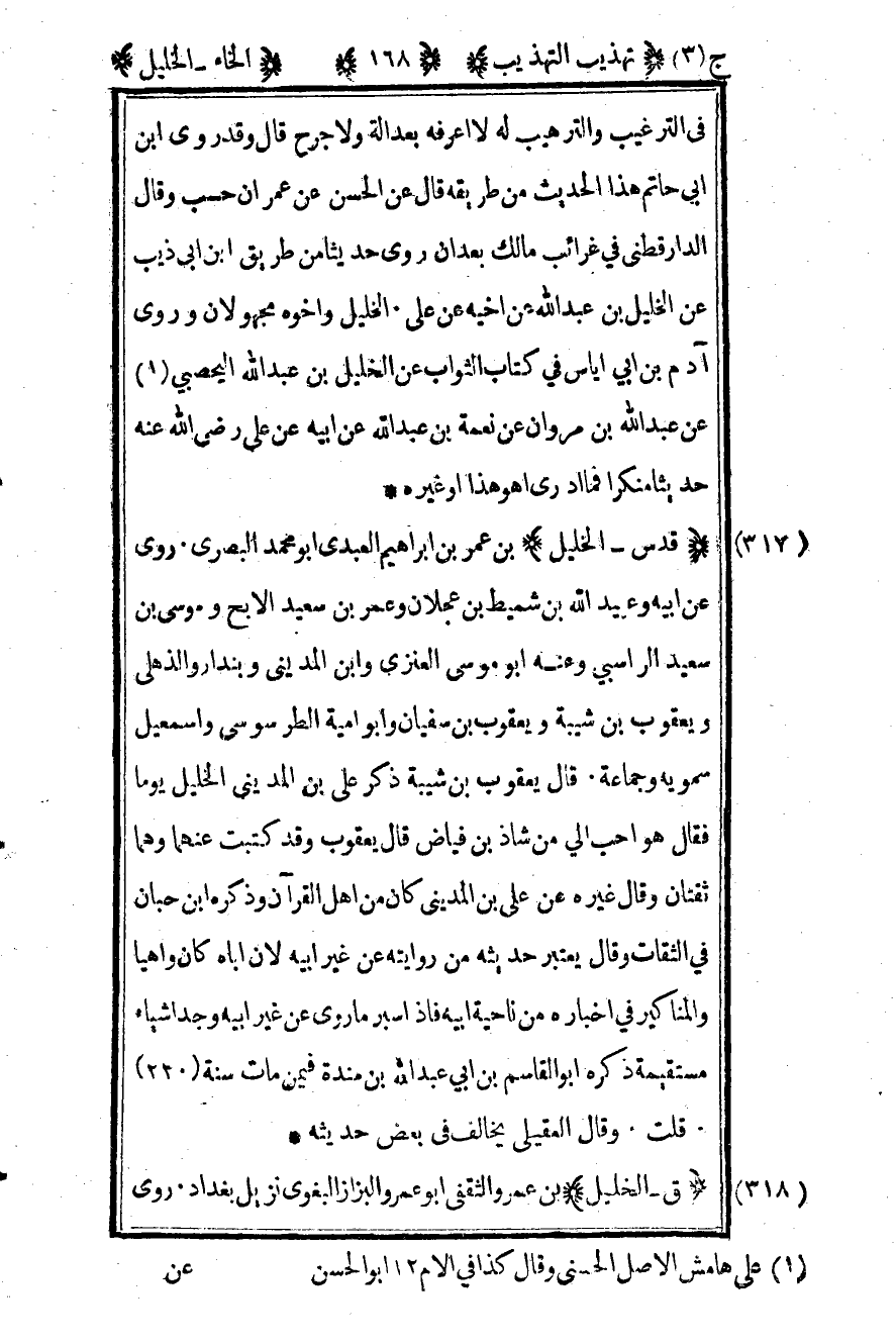 317- "قدس - الخليل" بن عمر بن إبراهيم العبدي أبو محمد البصري. روى عن أبيه وعبيد الله بن شميط بن عجلان وعمر بن سعيد الأبح وموسى بن سعيد الراسبي وعنه أبو موسى العنزي وابن المديني وبندار والذهلي ويعقوب بن شيبة ويعقوب بن سفيان وأبو أمية الطرسوسي وإسماعيل سمويه وجماعة. قال يعقوب بن شيبة ذكر علي بن المديني الخليل يوما فقال هو أحب إلي من شاذ بن فياض قال يعقوب وقد كتبت عنهما وهما ثقتان وقال غيره عن علي بن المديني كان من أهل القرآن وذكره ابن حبان في الثقات وقال يعتبر حديثه من روايته عن غير أبيه لأن أباه كان واهيا والمناكير في أخباره من ناحية أبيه فإذا سبر ما روى عن غير أبيه وجد أشياء مستقيمة ذكره أبو القاسم بن أبي عبد الله بن مندة فيمن مات سنة "220". قلت وقال العقيلي يخالف في بعض حديثه.