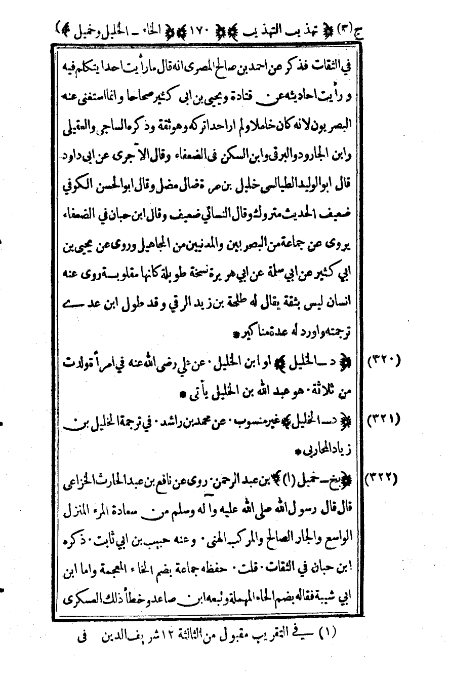 321- "د - الخليل" غير منسوب. عن محمد بن راشد في ترجمة الخليل بن زياد المحاربي.