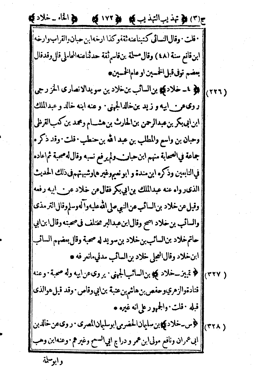 327- "تمييز - خلاد" بن السائب الجهني. يروي عن أبيه وله صحبة. وعنه قتادة والزهري وحفص بن هاشم بن عتبة بن أبي وقاص. وقيد قيل هو الذي قبله قلت والجمهور على أنه غيره.