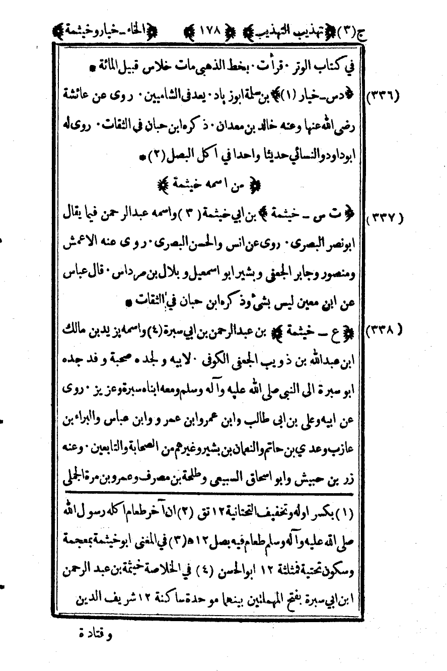2 في الخلاصة خيثمة بن عبد الرحمن ابن أبي سبرة بفتح المهملتين بينهما موحدة ساكنة 12 شريف الدين.