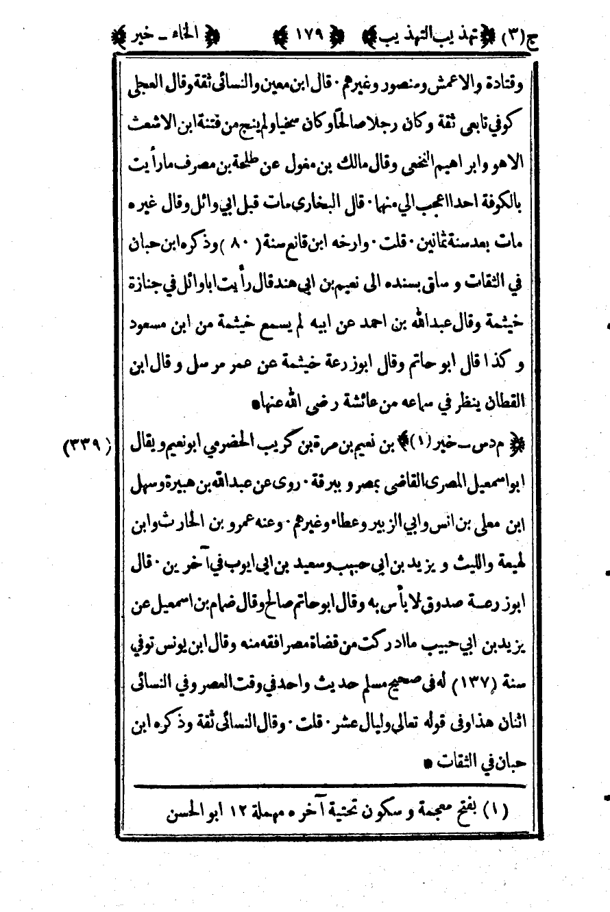339- "م د س - خير1" بن نعيم بن مرة بن كريب الحضرمي أبو نعيم ويقال أبو إسماعيل المصري القاضي بمصر وببرقة روى عن عبد الله بن هبيرة وسهل بن معلى بن أنس وأبي الزبير وعطاء وغيرهم. وعنه عمرو بن الحارث وابن لهيعة والليث ويزيد بن أبي حبيب وسعيد بن أبي أيوب في آخرين قال أبو زرعة صدوق لا بأس به وقال أبو حاتم صالح وقال ضمام بن إسماعيل عن يزيد بن أبي حبيب ما أدركت من قضاة مصر أفقه منه وقال ابن يونس توفي سنة "137" له في صحيح مسلم حديث واحد في وقت العصر وفي النسائي اثنان هذا وفي قوله تعالى: {وَلَيَالٍ عَشْرٍ} . قلت وقال النسائي ثقة وذكره ابن حبان في الثقات.