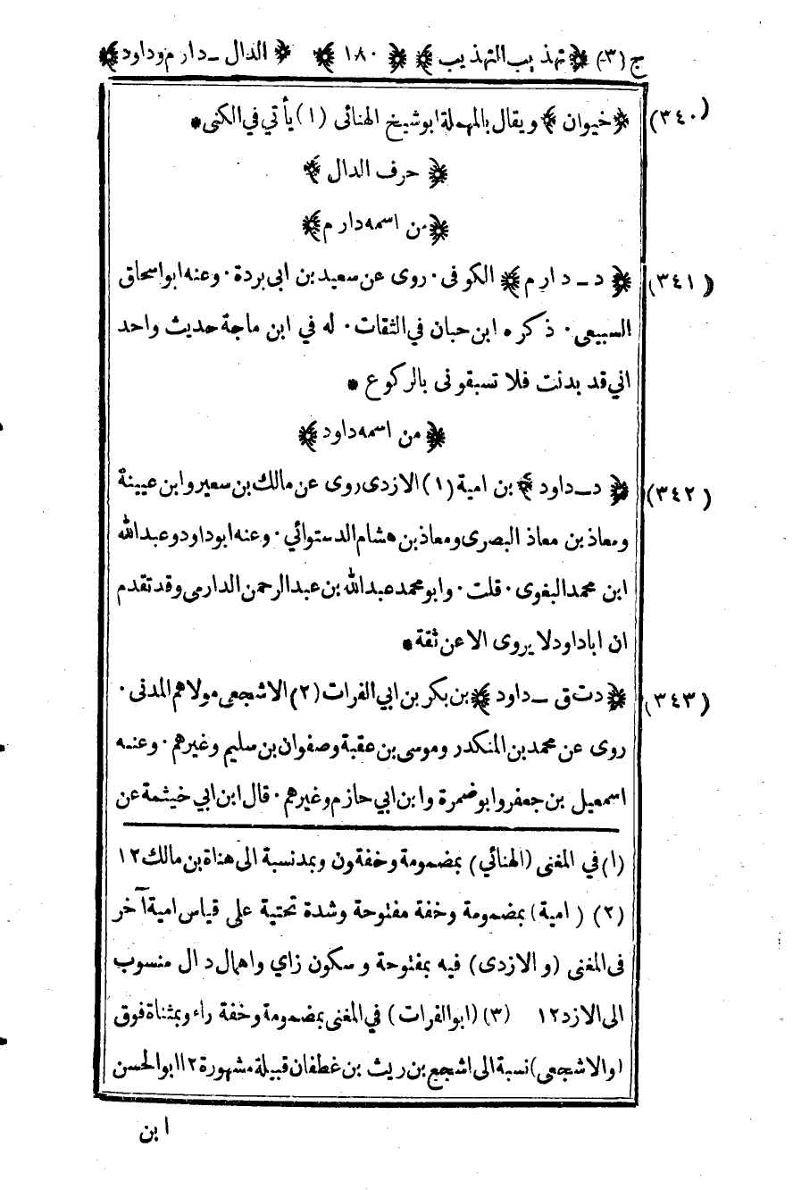 342- "د - داود" بن أمية1 الأزدي روى عن مالك بن سعير وابن عيينة ومعاذ بن معاذ البصري ومعاذ بن هشام الدستوائي. وعنه أبو داود وعبد الله بن محمد البغوي. قلت وأبو محمد عبد الله بن عبد الرحمن الدارمي وقد تقدم أن أبا داود لا يروي إلا عن ثقة.