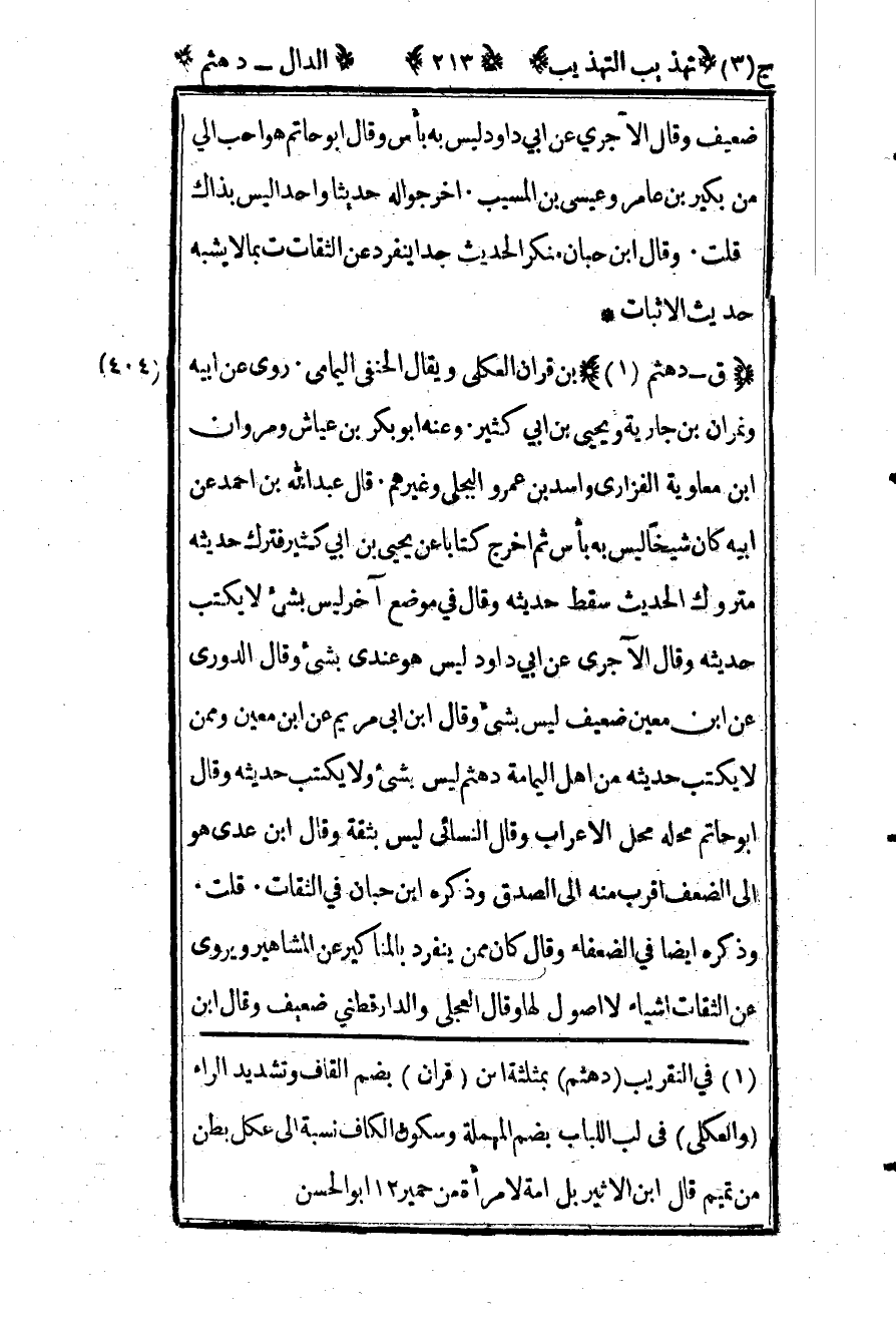 1 في التقريب "دهثم" بمثلثة ابن "قران" بضم القاف وتشديد الراء "والعكلي" في لب اللباب بضم المهملة وسكون الكاف نسبة إلى عكل بطن من تميم قال ابن الأثير بل أمة لامرأة من حمير 12 أبو الحسن.