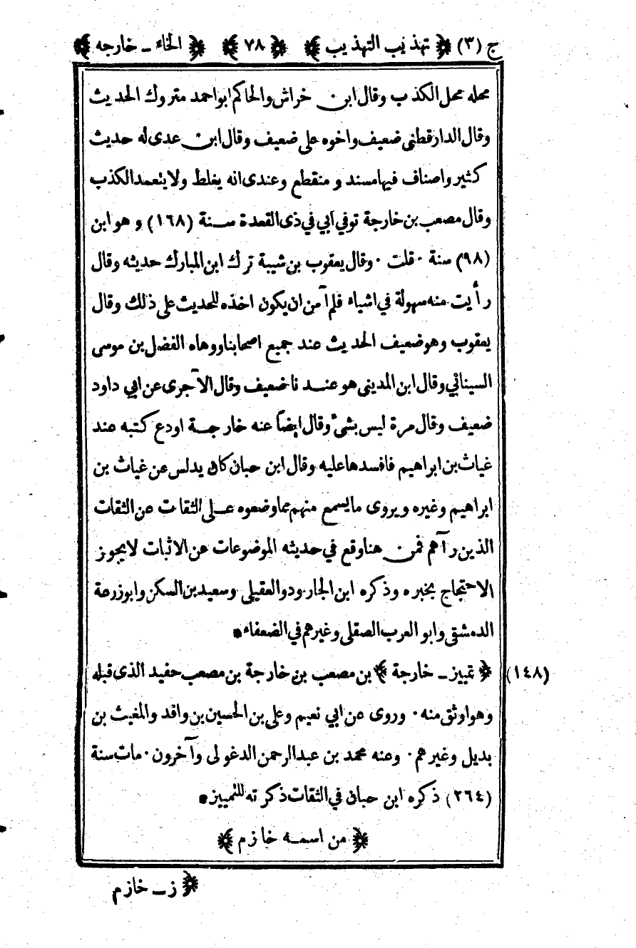 148- "تمييز - خارجة" بن مصعب بن خارجة بن مصعب حفيد الذي قبله وهو أوثق منه وروى عن أبي نعيم وعلي بن الحسين بن واقد والمغيث بن بديل وغيرهم وعنه محمد بن عبد الرحمن الدغولي وآخرون مات سنة "264" ذكره ابن حبان في الثقات ذكرته للتمييز.