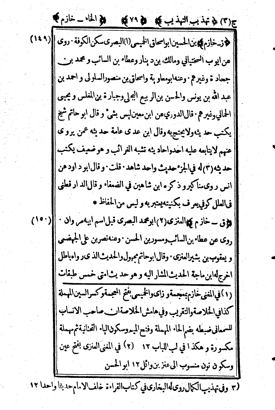 1 في المغني خازم بمعجمة وزاي والخميسي بفتح المعجمة وكسر السين المهملة كذا في الخلاصة والتقريب وفي هامش الخلاصة أن صاحب الأنساب للمعاني ضبطه بضم الحاء المهملة وفتح الميم وسكون الياء التحتانية ثم مهملة مكسورة وهكذا في لب اللباب 12.