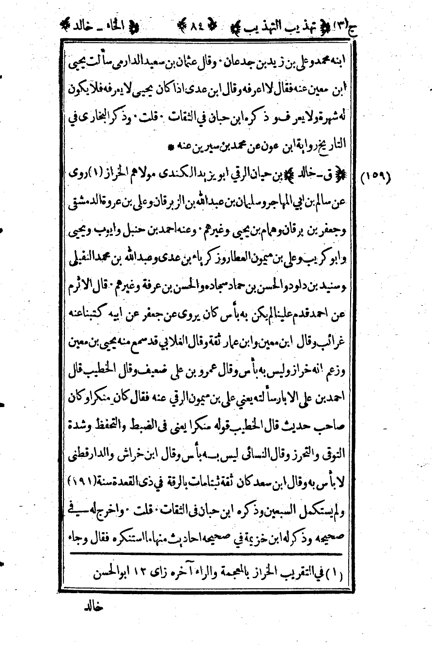 159- "ق - خالد" بن حيان الرقي أبو يزيد الكندي مولاهم الخراز1 روى عن سالم بن أبي المهاجر وسليمان بن عبد الله بن الزبرقان وعلي بن عروة الدمشقي وجعفر بن برقان وهمام بن يحيى وغيرهم وعنه أحمد بن حنبل وأيوب ويحيى وأبو كريب وعلي بن ميمون العطار وزكرياء بن عدي وعبد الله بن محمد النفيلي وسنيد بن داود والحسن بن حماد سجاده والحسن بن عرفة وغيرهم قال الأثرم عن أحمد قدم علينا لم يكن به بأس كان يروي عن جعفر عن أبيه كتبنا عنه غرائب وقال ابن معين وابن عمار ثقة وقال الغلابي قد سمع منه يحيى بن معين وزعم أنه خراز وليس به بأس وقال عمرو بن علي ضعيف وقال الخطيب قال أحمد بن علي الأبار سألته يعني علي بن ميمون الرقي عنه فقال كان منكرا وكان صاحب حديث قال الخطيب قوله منكرا يعني في الضبط والتحفظ وشدة التوقي والتحرز وقال النسائي ليس به بأس وقال ابن خراش والدارقطني لا بأس به وقال ابن سعد كان ثقة ثبتا مات بالرقة في ذي القعدة سنة "191" ولم يستكمل السبعين وذكره ابن حبان في الثقات. قلت وأخرج له في صحيحه وذكر له ابن خزيمة في صحيحه أحاديث منها ما استنكره فقال وجاء