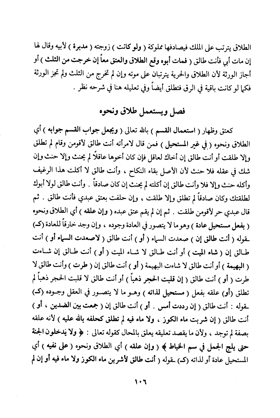 (وَإِنْ عَلَّقَهُ) أَيْ الطَّلَاقَ وَنَحْوَهُ (بِفِعْلِ مُسْتَحِيلٍ عَادَةً) وَهُوَ مَا لَا يُتَصَوَّرُ فِي الْعَادَةِ وُجُودُهُ، وَإِنْ، وَجَدَ خَارِقًا لِلْعَادَةِ (ك) قَوْلِهِ (أَنْتِ طَالِقٌ إنْ) صَعِدْت السَّمَاءَ (أَوْ) أَنْتِ طَالِقٌ (لَا صَعِدْت السَّمَاءَ أَوْ) أَنْتِ طَالِقٌ إنْ (شَاءَ الْمَيِّتُ) أَوْ أَنْتِ طَالِقٌ لَا شَاءَ الْمَيِّتُ (أَوْ) أَنْتِ طَالِقٌ إنْ شَاءَتْ (الْبَهِيمَةُ) أَوْ أَنْتِ طَالِقٌ لَا شَاءَتْ الْبَهِيمَةُ (أَوْ) أَنْتِ طَالِقٌ إنْ (طِرْتِ) وَأَنْتِ طَالِقٌ لَا طِرْتِ (أَوْ) أَنْتِ طَالِقٌ (إنْ قَلَبْت الْحَجَرَ ذَهَبًا) أَوْ أَنْتِ طَالِقٌ لَا قَلَبْت الْحَجَرَ ذَهَبًا لَمْ تَطْلُقْ (أَوْ) عَلَّقَهُ بِفِعْلِ (مُسْتَحِيلٍ لِذَاتِهِ) وَهُوَ مَا لَا يُتَصَوَّرُ فِي الْعَقْلِ وُجُودُهُ (كَ) قَوْلِهِ: أَنْتِ طَالِقٌ (إنْ رَدَدْتِ أَمْسِ. أَوْ) أَنْتِ طَالِقٌ إنْ (جَمَعْتِ بَيْنَ الضِّدَّيْنِ، أَوْ) أَنْتِ طَالِقٌ (إنْ شَرِبْتِ مَاءَ الْكُوزِ، وَلَا مَاءَ فِيهِ لَمْ تَطْلُقْ كَحَلِفِهِ بِاَللَّهِ عَلَيْهِ) ; لِأَنَّهُ عَلَّقَهُ بِصِفَةٍ لَمْ تُوجَدْ ; وَلِأَنَّ مَا يَقْصِدُ تَعْلِيقَهُ يُعَلَّقُ بِالْمُحَالِ كَقَوْلِهِ تَعَالَى: {وَلَا يَدْخُلُونَ الْجَنَّةَ حَتَّى يَلِجَ الْجَمَلُ فِي سَمِّ الْخِيَاطِ} [الأعراف: ٤٠] (وَإِنْ عَلَّقَهُ) أَيْ الطَّلَاقَ وَنَحْوَهُ (عَلَى نَفْيِهِ) أَيْ الْمُسْتَحِيلِ عَادَةً أَوْ لِذَاتِهِ (كَ) قَوْلِهِ (أَنْتِ طَالِقٌ لَأَشْرَبَنَّ مَاءَ الْكُوزِ وَلَا مَاءَ فِيهِ أَوْ إنْ لَمْ