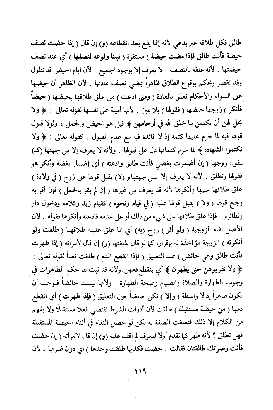 (وَ) إنْ قَالَ لِامْرَأَتِهِ (إذَا طَهُرْت فَأَنْتِ طَالِقٌ وَهِيَ حَائِضٌ) عِنْدَ التَّعْلِيقِ (فَإِذَا انْقَطَعَ الدَّمُ) طَلُقَتْ نَصًّا لِقَوْلِهِ تَعَالَى: {وَلَا تَقْرَبُوهُنَّ حَتَّى يَطْهُرْنَ} [البقرة: ٢٢٢] أَيْ يَنْقَطِعُ دَمُهُنَّ. ; وَلِأَنَّهُ قَدْ ثَبَتَ لَهَا حُكْمُ الطَّاهِرَاتِ فِي وُجُوبِ الطَّهَارَةِ وَالصَّلَاةِ وَالصِّيَامِ وَصِحَّةِ الطَّهَارَةِ. وَلِأَنَّهَا لَيْسَتْ حَائِضًا فَوَجَبَ أَنْ تَكُونَ طَاهِرًا إذْ لَا وَاسِطَةَ (وَإِلَّا) تَكُنْ حَائِضًا حِينَ التَّعْلِيقِ (فَإِذَا طَهُرَتْ) أَيْ انْقَطَعَ دَمُهَا (مِنْ حَيْضَةٍ مُسْتَقْبَلَةٍ) طَلُقَتْ ; لِأَنَّ أَدَوَاتِ الشَّرْطِ تَقْتَضِي فِعْلًا مُسْتَقْبَلًا وَلَا يُفْهَمُ مِنْ الْكَلَامِ إلَّا ذَلِكَ فَتَعَلَّقَتْ الصِّفَةُ بِهِ لَكِنْ لَوْ حَصَلَ النَّقَاءُ فِي أَثْنَاءِ الْحَيْضَةِ الْمُسْتَقْبَلَةِ فَهَلْ تَطْلُقُ؟ نَعَمْ ; لِأَنَّهُ طُهْرٌ كَمَا تَقَدَّمَ أَوْ لَا لِلْعُرْفِ لَمْ أَقِفْ عَلَيْهِ.