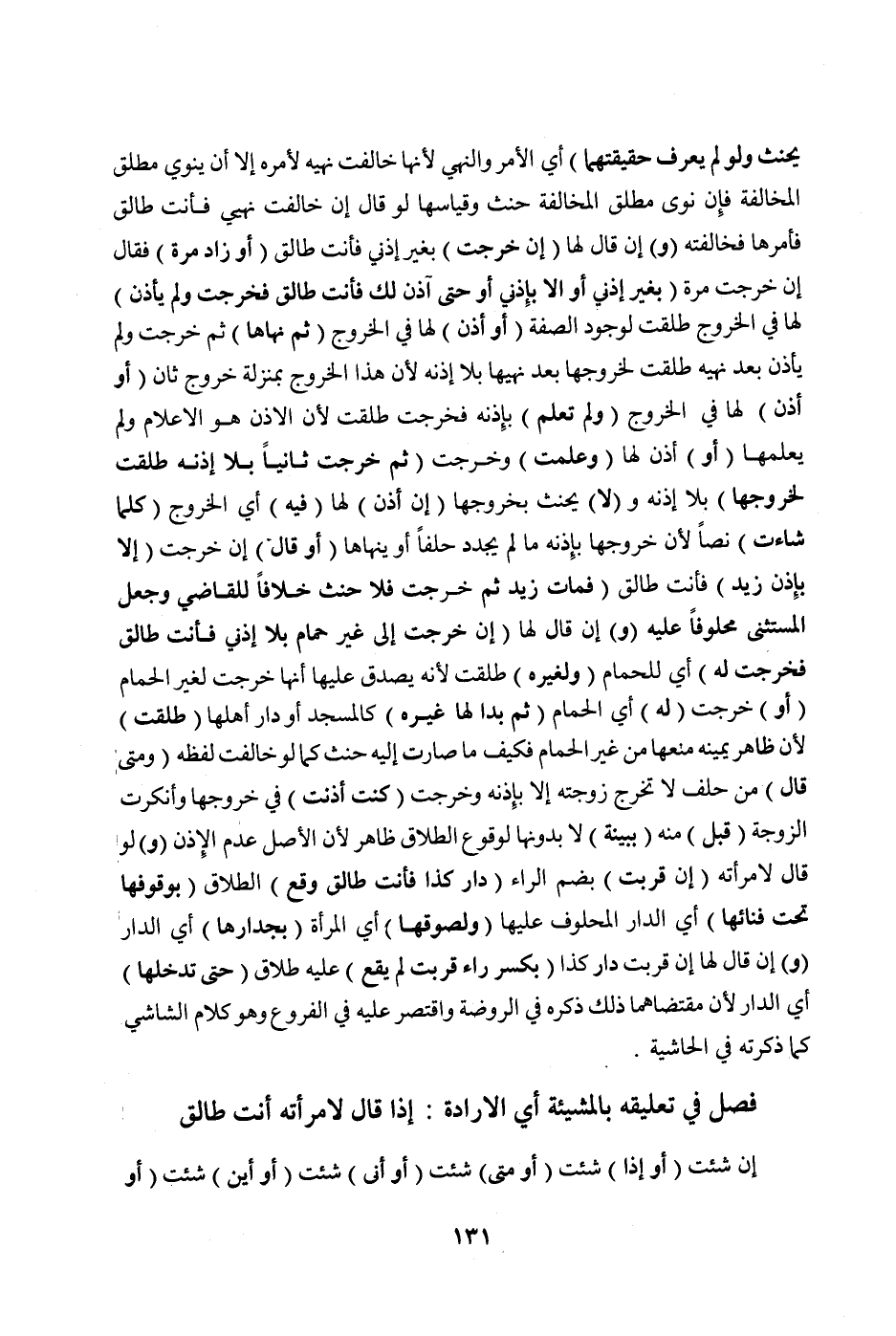 فَصْلٌ فِي تَعْلِيقِهِ بِالْمَشِيئَةِ أَيْ الْإِرَادَةِ. إذَا قَالَ لِامْرَأَتِهِ: أَنْتِ طَالِقٌ إنْ شِئْتِ (أَوْ إذَا) شِئْتِ (أَوْ مَتَى) شِئْتِ (أَوْ أَنَّى) شِئْتِ (أَوْ أَيْنَ) شِئْتِ (أَوْ