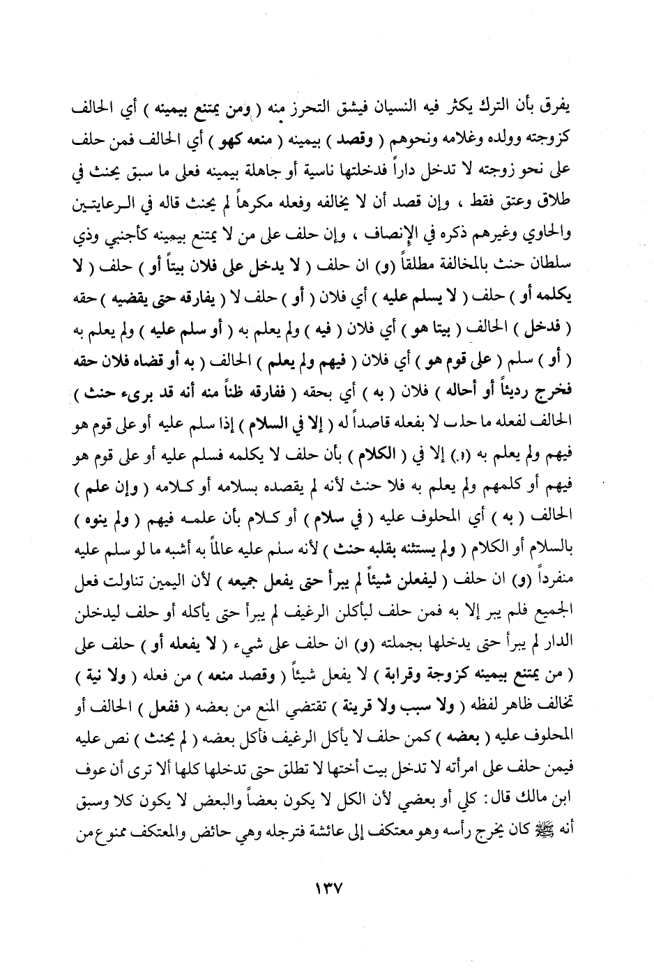 (وَ) إنْ حَلَفَ (لَيَفْعَلَنَّ شَيْئًا لَمْ يَبْرَأْ حَتَّى يَفْعَلَ جَمِيعَهُ) ; لِأَنَّ الْيَمِينَ تَنَاوَلَتْ فِعْلَ الْجَمِيعِ فَلَمْ يَبْرَأْ إلَّا بِهِ فَمَنْ حَلَفَ لَيَأْكُلَنَّ الرَّغِيفَ لَمْ يَبْرَأْ حَتَّى يَأْكُلَهُ أَوْ حَلَفَ لَيَدْخُلَنَّ الدَّارَ لَمْ يَبْرَأْ حَتَّى يَدْخُلَهَا بِجُمْلَتِهِ (و) إنْ حَلَفَ عَلَى شَيْءٍ (لَا يَفْعَلُهُ أَوْ) حَلَفَ عَلَى (مَنْ يَمْتَنِعُ بِيَمِينِهِ كَزَوْجَةٍ وَقَرَابَةٍ) لَا يَفْعَلُ شَيْئًا (وَقَصَدَ مَنْعَهُ) مِنْ فِعْلِهِ (وَلَا نِيَّةَ) تُخَالِفُ ظَاهِرَ لَفْظِهِ (وَلَا سَبَبَ وَلَا قَرِينَةَ) تَقْتَضِي الْمَنْعَ مِنْ بَعْضِهِ (فَفَعَلَ) الْحَالِفُ أَوْ الْمَحْلُوفُ عَلَيْهِ (بَعْضَهُ) كَمَنْ حَلَفَ لَا يَأْكُلُ الرَّغِيفَ فَأَكَلَ بَعْضَهُ (لَمْ يَحْنَثْ) نَصَّ عَلَيْهِ فِيمَنْ حَلَفَ عَلَى امْرَأَتِهِ لَا تَدْخُلُ بَيْتَ أُخْتِهَا لَا تَطْلُقُ حَتَّى تَدْخُلَهَا كُلَّهَا أَلَا تَرَى أَنَّ عَوْفَ بْنَ مَالِكٍ قَالَ: كُلِّي أَوْ بَعْضِي ; لِأَنَّ الْكُلَّ لَا يَكُونُ بَعْضًا وَالْبَعْضُ لَا يَكُونُ كُلًّا وَسَبَقَ «أَنَّهُ صَلَّى اللَّهُ عَلَيْهِ وَسَلَّمَ كَانَ يُخْرِجُ رَأْسَهُ وَهُوَ مُعْتَكِفٌ إلَى عَائِشَةَ فَتُرَجِّلُهُ وَهِيَ حَائِضٌ» وَالْمُعْتَكِفُ مَمْنُوعٌ مِنْ