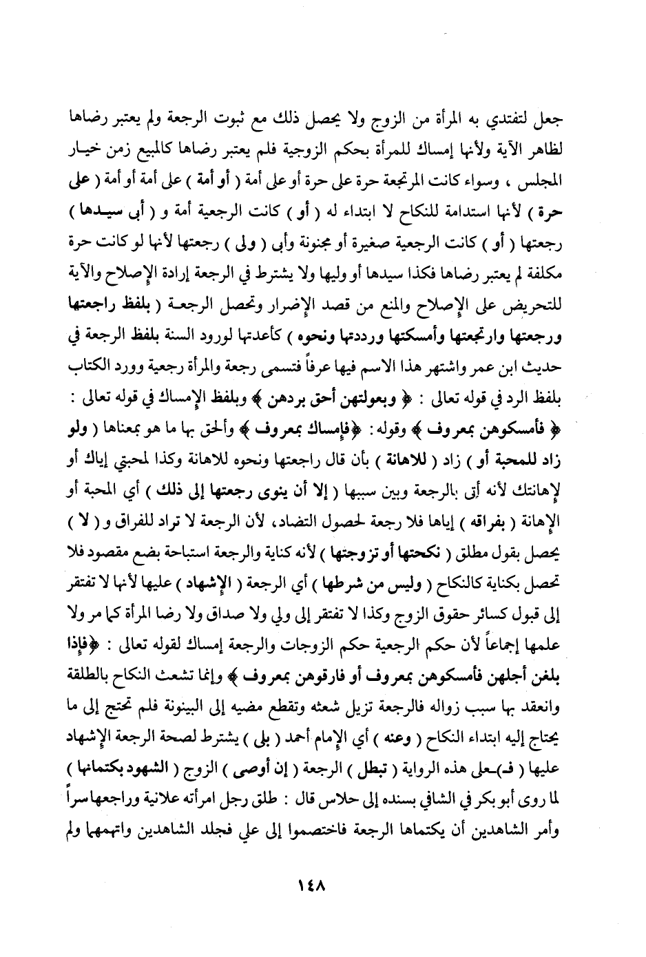 جُعِلَ لِتَفْتَدِيَ بِهِ الْمَرْأَةُ مِنْ الزَّوْجِ وَلَا يَحْصُلُ ذَلِكَ مَعَ ثُبُوتِ الرَّجْعَةِ وَلَمْ يُعْتَبَرْ رِضَاهَا لِظَاهِرِ الْآيَةِ وَلِأَنَّهَا إمْسَاكٌ لِلْمَرْأَةِ بِحُكْمِ الزَّوْجِيَّةِ فَلَمْ يُعْتَبَرْ رِضَاهَا كَالْمَبِيعِ زَمَنَ خِيَارِ الْمَجْلِسِ، وَسَوَاءٌ كَانَتْ الْمُرْتَجَعَةُ حُرَّةً عَلَى حُرَّةٍ أَوْ عَلَى أَمَةٍ (أَوْ أَمَةً) عَلَى أَمَةٍ أَوْ أَمَةً (عَلَى حُرَّةٍ) لِأَنَّهَا اسْتِدَامَةٌ لِلنِّكَاحِ لَا ابْتِدَاءٌ لَهُ (أَوْ) كَانَتْ الرَّجْعِيَّةُ أَمَةً و (أَبَى سَيِّدُهَا) رَجْعَتَهَا (أَوْ) كَانَتْ الرَّجْعِيَّةُ صَغِيرَةً أَوْ مَجْنُونَةً وَأَبَى (وَلِيٌّ) رَجْعَتَهَا لِأَنَّهَا لَوْ كَانَتْ حُرَّةً مُكَلَّفَةً لَمْ يُعْتَبَرْ رِضَاهَا فَكَذَا سَيِّدُهَا أَوْ وَلِيُّهَا وَلَا يُشْتَرَطُ فِي الرَّجْعَةِ إرَادَةُ الْإِصْلَاحِ وَالْآيَةُ لِلتَّحْرِيضِ عَلَى الْإِصْلَاحِ وَالْمَنْعِ مِنْ قَصْدِ الْإِضْرَارِ.