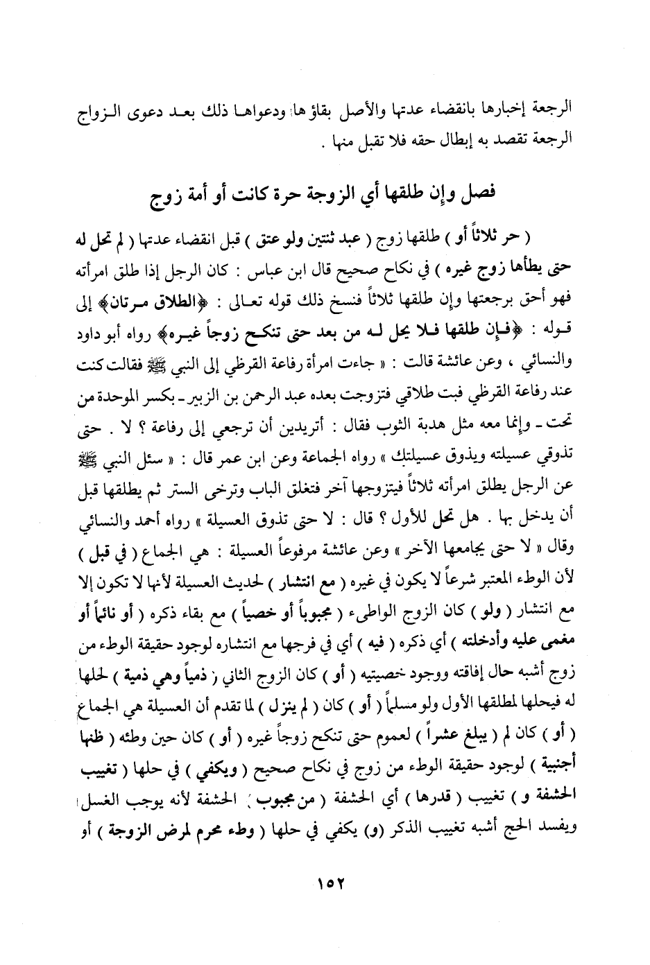 فَصْلٌ وَإِنْ طَلَّقَهَا أَيْ الزَّوْجَةَ حُرَّةً كَانَتْ أَوْ أَمَةً زَوْجٌ (حُرٌّ ثَلَاثًا أَوْ) طَلَّقَهَا زَوْجٌ (عَبْدٌ ثِنْتَيْنِ وَلَوْ عَتَقَ) قَبْلَ انْقِضَاءِ عِدَّتِهَا (لَمْ تَحِلَّ لَهُ حَتَّى يَطَأَهَا زَوْجٌ غَيْرُهُ) فِي نِكَاحٍ صَحِيحٍ قَالَ ابْنُ عَبَّاسٍ: كَانَ الرَّجُلُ إذَا طَلَّقَ امْرَأَتَهُ فَهُوَ أَحَقُّ بِرَجْعَتِهَا وَإِنْ طَلَّقَهَا ثَلَاثًا فَنَسَخَ ذَلِكَ قَوْله تَعَالَى -: {الطَّلَاقُ مَرَّتَانِ} [البقرة: ٢٢٩] إلَى قَوْلِهِ: {فَإِنْ طَلَّقَهَا فَلَا تَحِلُّ لَهُ مِنْ بَعْدُ حَتَّى تَنْكِحَ زَوْجًا غَيْرَهُ} [البقرة: ٢٣٠] رَوَاهُ أَبُو دَاوُد وَالنَّسَائِيُّ، وَعَنْ عَائِشَةَ قَالَتْ: " «جَاءَتْ امْرَأَةُ رِفَاعَةَ الْقُرَظِيِّ إلَى النَّبِيِّ صَلَّى اللَّهُ عَلَيْهِ وَسَلَّمَ فَقَالَتْ كُنْتُ عِنْدَ رِفَاعَةَ الْقُرَظِيِّ فَبَتَّ طَلَاقِي فَتَزَوَّجْت بَعْدَهُ عَبْدَ الرَّحْمَنِ بْنَ الزَّبِيرِ - بِكَسْرِ الْمُوَحَّدَةِ مِنْ تَحْتُ - وَإِنَّمَا مَعَهُ مِثْلُ هُدْبَةِ الثَّوْبِ فَقَالَ: أَتُرِيدِينَ أَنْ تَرْجِعِي إلَى رِفَاعَةَ؟ لَا حَتَّى تَذُوقِيَ عُسَيْلَتَهُ وَيَذُوقَ عُسَيْلَتَكِ» رَوَاهُ الْجَمَاعَةُ.