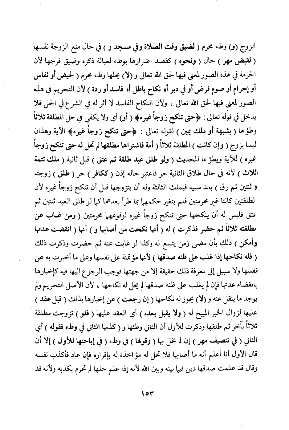 الزَّوْجِ (وَ) وَطْءٌ مُحَرَّمٌ (لِضِيقِ وَقْتِ الصَّلَاةِ وَفِي مَسْجِدٍ و) فِي حَالِ مَنْعِ الزَّوْجَةِ نَفْسَهَا (لِقَبْضِ مَهْرٍ) حَالٍّ (وَنَحْوَهُ) كَقَصْدِ إضْرَارِهَا بِوَطْءٍ لِعَبَالَةِ ذَكَرِهِ وَضِيقِ فَرْجِهَا ; لِأَنَّ الْحُرْمَةَ فِي هَذِهِ الصُّوَرِ لِمَعْنًى فِيهَا لِحَقِّ اللَّهِ - تَعَالَى - و (لَا) يَحِلُّهَا وَطْءٌ مُحَرَّمٌ (لِحَيْضٍ أَوْ نِفَاسٍ أَوْ إحْرَامٍ أَوْ صَوْمِ فَرْضٍ أَوْ فِي دُبُرٍ أَوْ نِكَاحٍ بَاطِلٍ أَوْ فَاسِدٍ أَوْ رِدَّةٍ) لِأَنَّ التَّحْرِيمَ فِي هَذِهِ الصُّوَرِ لِمَعْنًى فِيهَا لِحَقِّ اللَّهِ - تَعَالَى -، وَلِأَنَّ النِّكَاحَ الْفَاسِدَ لَا أَثَرَ لَهُ فِي الشَّرْعِ فِي الْحِلِّ فَلَا يَدْخُلُ فِي قَوْله تَعَالَى: {حَتَّى تَنْكِحَ زَوْجًا غَيْرَهُ} [البقرة: ٢٣٠] (أَوْ) أَيْ وَلَا يَكْفِي فِي حِلِّ الْمُطَلَّقَةِ ثَلَاثًا وَطْؤُهَا (بِشُبْهَةٍ أَوْ مِلْكِ يَمِينٍ) لِقَوْلِهِ تَعَالَى -: {حَتَّى تَنْكِحَ زَوْجًا غَيْرَهُ} [البقرة: ٢٣٠] الْآيَةَ وَهَذَانِ لَيْسَا بِزَوْجٍ.