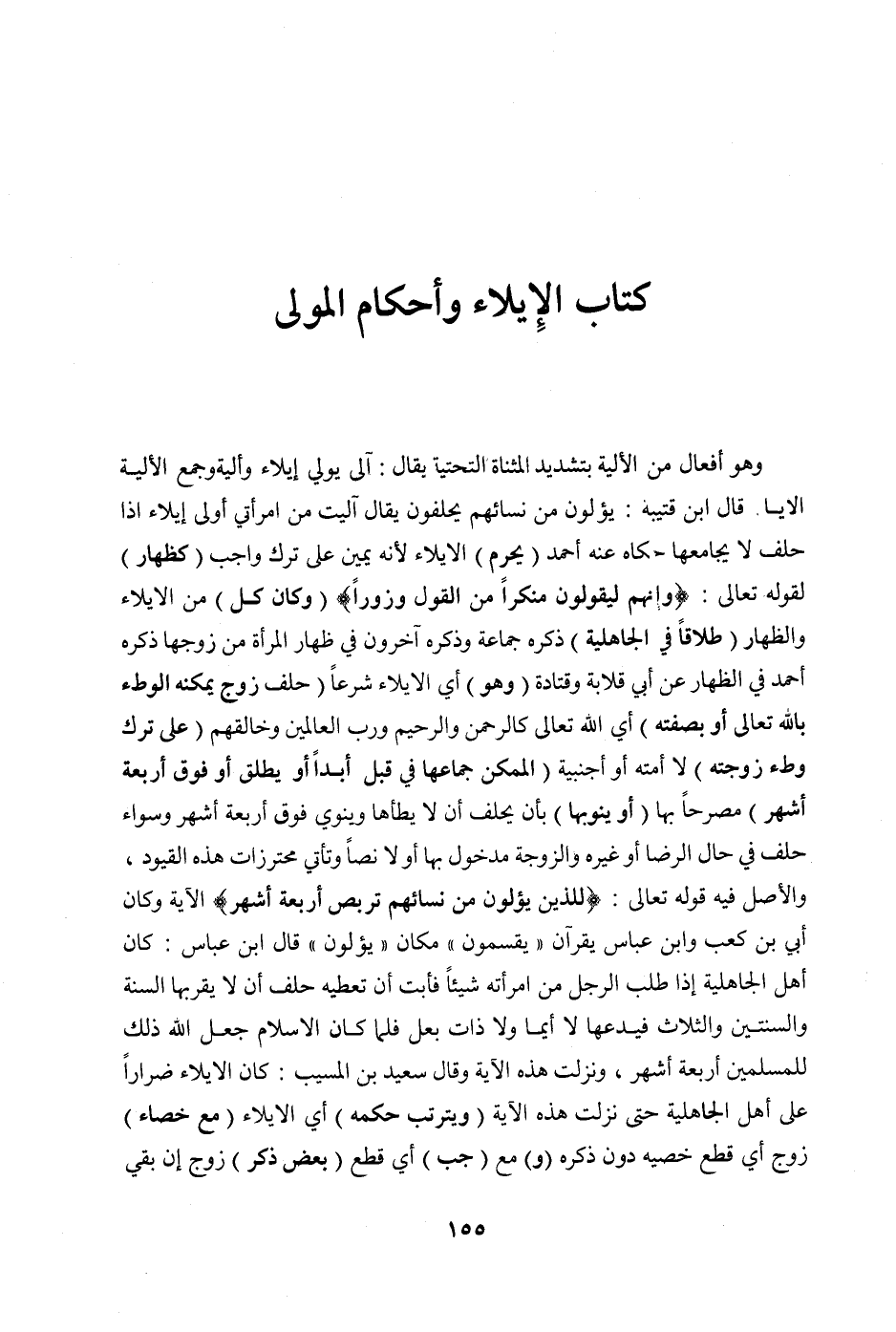 وَهُوَ إفْعَالٌ مِنْ الْأَلِيَّةِ بِتَشْدِيدِ الْمُثَنَّاةِ التَّحْتِيَّةِ يُقَالُ: آلَى يُولِي إيلَاءً وَأَلِيَّةً وَجَمْعُ الْأَلِيَّةِ أَلَايَا قَالَ ابْنُ قُتَيْبَةَ: يُؤْلُونَ مِنْ نِسَائِهِمْ يَحْلِفُونَ يُقَال آلَيْتُ مِنْ امْرَأَتِي أُولِي إيلَاءً إذَا حَلَفَ لَا يُجَامِعُهَا حَكَاهُ عَنْهُ أَحْمَدُ (يُحْرَمُ) الْإِيلَاءُ لِأَنَّهُ يَمِينٌ عَلَى تَرْكِ وَاجِبٍ (كَظِهَارٍ) لِقَوْلِهِ تَعَالَى -: {وَإِنَّهُمْ لَيَقُولُونَ مُنْكَرًا مِنْ الْقَوْلِ وَزُورًا} [المجادلة: ٢] (وَكَانَ كُلٌّ) مِنْ الْإِيلَاءِ وَالظِّهَارِ (طَلَاقًا فِي الْجَاهِلِيَّةِ) ذَكَرَهُ جَمَاعَةٌ وَذَكَرَهُ آخَرُونَ فِي ظِهَارِ الْمَرْأَةِ مِنْ زَوْجِهَا ذَكَرَهُ أَحْمَدُ فِي الظِّهَارِ عَنْ أَبِي قِلَابَةَ وَقَتَادَةَ (وَهُوَ) أَيْ الْإِيلَاءُ شَرْعًا (حَلِفُ زَوْجٍ يُمْكِنُهُ الْوَطْءُ بِاَللَّهِ تَعَالَى أَوْ بِصِفَتِهِ) أَيْ اللَّهِ تَعَالَى كَالرَّحْمَنِ وَالرَّحِيمِ وَرَبِّ الْعَالَمِينَ وَخَالِقِهِمْ (عَلَى تَرْكِ وَطْءِ زَوْجَتِهِ) لَا أَمَتِهِ أَوْ أَجْنَبِيَّةٍ (الْمُمْكِنِ جِمَاعُهَا فِي قُبُلٍ أَبَدًا أَوْ يُطْلِقُ أَوْ فَوْقَ أَرْبَعَةِ أَشْهُرٍ) مُصَرِّحًا بِهَا (أَوْ يَنْوِيَهَا) بِأَنْ يَحْلِفَ أَنْ لَا يَطَأَهَا وَيَنْوِيَ فَوْقَ أَرْبَعَةِ أَشْهُرٍ وَسَوَاءٌ حَلَفَ فِي حَالِ الرِّضَا أَوْ غَيْرِهِ وَالزَّوْجَةُ مَدْخُولٌ بِهَا أَوْ لَا نَصًّا وَتَأْتِي مُحْتَرَزَاتُ هَذِهِ الْقُيُودِ، وَالْأَصْلُ فِيهِ قَوْله تَعَالَى: {لِلَّذِينَ يُؤْلُونَ مِنْ نِسَائِهِمْ تَرَبُّصُ أَرْبَعَةِ أَشْهُرٍ} [البقرة: ٢٢٦] الْآيَةَ وَكَانَ أُبَيّ بْنُ كَعْبٍ وَابْنُ عَبَّاسٍ يَقْرَآنِ " يُقْسِمُونَ " مَكَانَ " يُؤْلُونَ " قَالَ ابْنُ عَبَّاسٍ: كَانَ أَهْلُ الْجَاهِلِيَّةِ إذَا طَلَبَ الرَّجُلُ مِنْ امْرَأَتِهِ شَيْئًا فَأَبَتْ أَنْ تُعْطِيَهُ حَلَفَ أَنْ لَا يَقْرَبهَا السَّنَةَ وَالسَّنَتَيْنِ وَالثَّلَاثَ فَيَدَعَهَا لَا أَيِّمًا وَلَا ذَاتَ بَعْلٍ فَلَمَّا كَانَ الْإِسْلَامُ جَعَلَ اللَّهُ ذَلِكَ لِلْمُسْلِمِينَ أَرْبَعَةَ أَشْهُرٍ، وَنَزَلَتْ هَذِهِ الْآيَةُ وَقَالَ سَعِيدُ بْنُ الْمُسَيِّبِ: كَانَ الْإِيلَاءُ ضِرَارًا عَلَى أَهْلِ الْجَاهِلِيَّةِ حَتَّى نَزَلَتْ هَذِهِ الْآيَةُ.