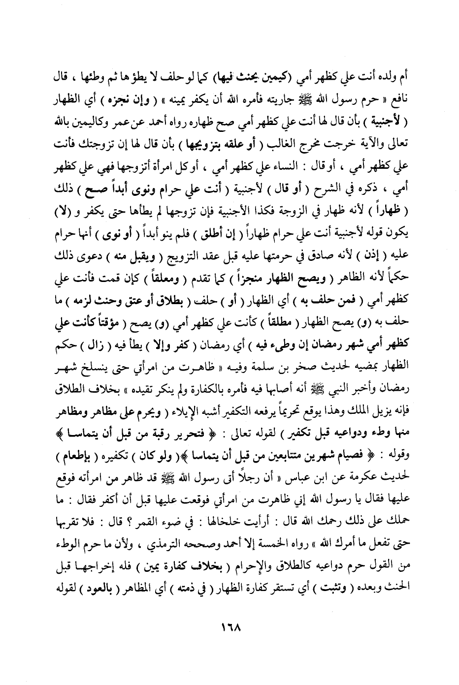 (وَ) يَصِحُّ الظِّهَارُ (مُطْلَقًا) كَأَنْتِ عَلَيَّ كَظَهْرِ أُمِّي (وَ) يَصِحُّ (مُؤَقَّتًا كَأَنْتِ عَلَيَّ كَظَهْرِ أُمِّي شَهْرَ رَمَضَانَ إنْ وَطِئَ فِيهِ) أَيْ رَمَضَانَ (كَفَّرَ وَإِلَّا) يَطَأْ فِيهِ (زَالَ) حُكْمُ الظِّهَارِ بِمُضِيِّهِ لِحَدِيثِ صَخْرِ بْنِ سَلَمَةَ وَفِيهِ ( «ظَاهَرْتُ مِنْ امْرَأَتِي حَتَّى يَنْسَلِخَ شَهْرُ رَمَضَانَ وَأَخْبَرَ النَّبِيَّ صَلَّى اللَّهُ عَلَيْهِ وَسَلَّمَ أَنَّهُ أَصَابَهَا فِيهِ فَأَمَرَهُ بِالْكَفَّارَةِ وَلَمْ يُنْكِرْ تَقَيُّدَهُ» ) بِخِلَافِ الطَّلَاقِ فَإِنَّهُ يُزِيلُ الْمِلْكَ وَهَذَا يُوقِعُ تَحْرِيمًا يَرْفَعُهُ التَّكْفِيرُ أَشْبَهَ الْإِيلَاءَ.