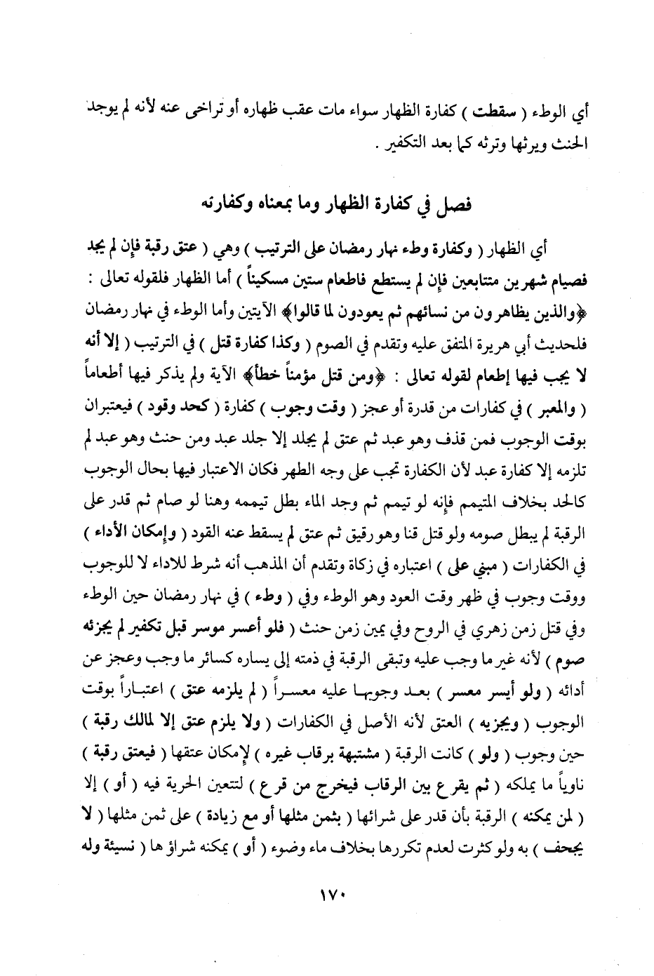 وَكَفَّارَتِهِ أَيْ الظِّهَارِ (وَكَفَّارَةُ وَطْءِ نَهَارِ رَمَضَانَ عَلَى التَّرْتِيبِ) وَهِيَ (عِتْقُ رَقَبَةٍ فَإِنْ لَمْ يَجِدْ فَصِيَامُ شَهْرَيْنِ مُتَتَابِعَيْنِ فَإِنْ لَمْ يَسْتَطِعْ فَإِطْعَامُ سِتِّينَ مِسْكِينًا) أَمَّا الظِّهَارُ فَلِقَوْلِهِ - تَعَالَى -: {وَاَلَّذِينَ يُظَاهِرُونَ مِنْ نِسَائِهِمْ ثُمَّ يَعُودُونَ لِمَا قَالُوا} [المجادلة: ٣] الْآيَتَيْنِ وَأَمَّا الْوَطْءُ فِي نَهَارِ رَمَضَانَ فَلِحَدِيثِ أَبِي هُرَيْرَةَ الْمُتَّفَقِ عَلَيْهِ وَتَقَدَّمَ فِي الصَّوْمِ (وَكَذَا كَفَّارَةُ قَتْلٍ) فِي التَّرْتِيبِ (إلَّا أَنَّهُ لَا يَجِبُ فِيهَا إطْعَامٌ) لِقَوْلِهِ تَعَالَى -: {وَمَنْ قَتَلَ مُؤْمِنًا خَطَأً} [النساء: ٩٢] الْآيَةَ وَلَمْ يَذْكُرْ فِيهَا إطْعَامًا.
