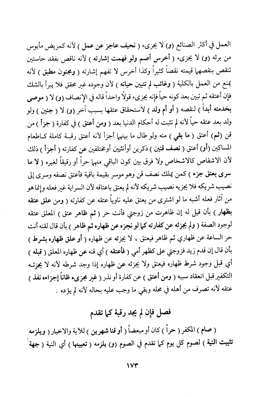 الْعَمَلِ فِي أَكْثَرِ الصَّنَائِعِ (وَ) لَا يُجْزِئُ (نَحِيفٌ عَاجِزٌ عَنْ عَمَلٍ) ; لِأَنَّهُ كَمَرِيضٍ مَأْيُوسٍ مِنْ بُرْئِهِ (وَ) لَا يُجْزِئُ (أَخْرَسُ أَصَمُّ وَلَوْ فُهِمَتْ إشَارَتُهُ) لِأَنَّهُ نَاقِصٌ بِفَقْدِ حَاسَّتَيْنِ تَنْقُصُ بِنَقْصِهِمَا قِيمَتُهُ نَقْصًا كَثِيرًا وَكَذَا أَخْرَسُ لَا تُفْهَمُ إشَارَتُهُ (وَمَجْنُونٌ مُطْبَقٌ) لِأَنَّهُ يَمْنَعُ مِنْ الْعَمَلِ بِالْكُلِّيَّةِ (وَغَائِبٌ لَمْ تَتَبَيَّنْ حَيَاتُهُ) لِأَنَّ وُجُودَهُ غَيْرُ مُحَقَّقٍ فَلَا يَبْرَأُ بِالشَّكِّ فَإِنْ أَعْتَقَهُ ثُمَّ تَبَيَّنَ بَعْدُ كَوْنُهُ حَيًّا فَإِنَّهُ يُجْزِئُ قَوْلًا وَاحِدًا قَالَهُ فِي الْإِنْصَافِ (وَ) لَا (مُوصَى بِخِدْمَتِهِ أَبَدًا) لِنَقْصِهِ (أَوْ أُمُّ وَلَدٍ) لِاسْتِحْقَاقِ عِتْقِهَا بِسَبَبٍ آخَرَ (وَ) لَا (جَنِينٌ) وَلَوْ وُلِدَ بَعْدَ عِتْقِهِ حَيًّا لِأَنَّهُ لَمْ تَثْبُتْ لَهُ أَحْكَامُ الدُّنْيَا بَعْدُ.