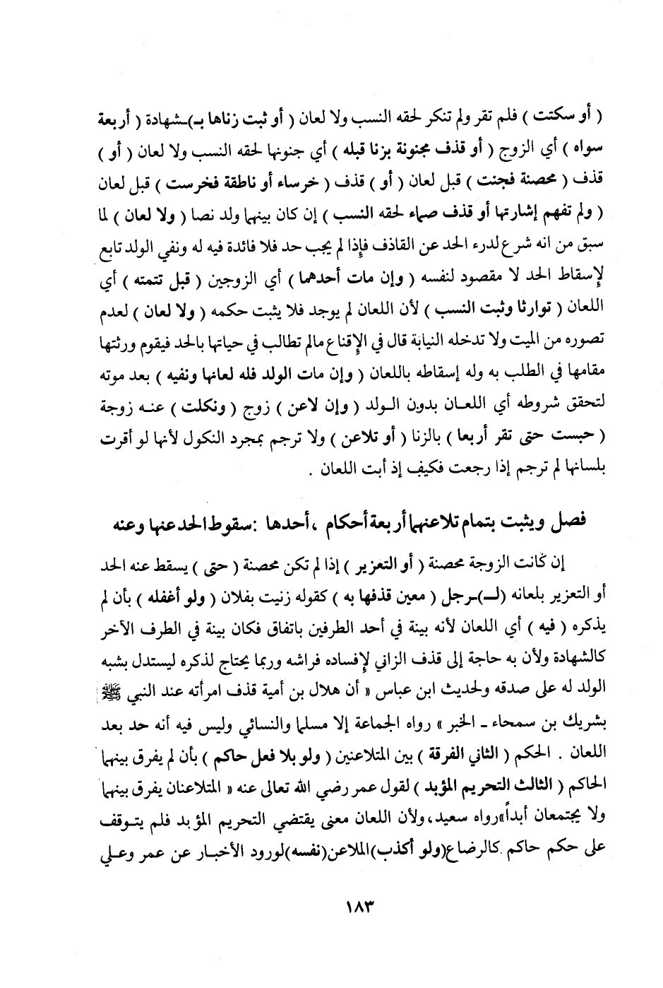 فَصْلٌ وَيَثْبُتُ بِتَمَامِ تَلَاعُنِهِمَا أَرْبَعَةُ أَحْكَامٍ، أَحَدُهَا: سُقُوطُ الْحَدِّ عَنْهَا وَعَنْهُ إنْ كَانَتْ الزَّوْجَةُ مُحْصَنَةً (أَوْ التَّعْزِيرُ) إذَا لَمْ تَكُنْ مُحْصَنَةً (حَتَّى) يَسْقُطَ عَنْهُ الْحَدُّ أَوْ التَّعْزِيرُ بِلِعَانِهِ (لِ) رَجُلٍ (مُعَيَّنٍ قَذَفَهَا بِهِ) كَقَوْلِهِ زَنَيْتِ بِفُلَانٍ (وَلَوْ أَغْفَلَهُ) بِأَنْ لَمْ يَذْكُرْهُ (فِيهِ) أَيْ اللِّعَانِ لِأَنَّهُ بَيِّنَةٌ فِي أَحَدِ الطَّرَفَيْنِ بِاتِّفَاقٍ فَكَانَ بَيِّنَةً فِي الطَّرَفِ الْآخَرِ كَالشَّهَادَةِ وَلِأَنَّ بِهِ حَاجَةً إلَى قَذْفِ الزَّانِي لِإِفْسَادِهِ فِرَاشَهُ وَرُبَّمَا يَحْتَاجُ لِذِكْرِهِ لِيَسْتَدِلَّ بِشَبَهِ الْوَلَدِ لَهُ عَلَى صِدْقِهِ وَلِحَدِيثِ ابْنِ عَبَّاسٍ ( «أَنَّ هِلَالَ بْنَ أُمَيَّةَ قَذَفَ امْرَأَتَهُ عِنْدَ النَّبِيِّ صَلَّى اللَّهُ عَلَيْهِ وَسَلَّمَ بِشَرِيكِ ابْنِ سَحْمَاءَ» - الْخَبَرُ (رَوَاهُ الْجَمَاعَةُ إلَّا مُسْلِمًا وَالنَّسَائِيُّ وَلَيْسَ فِيهِ أَنَّهُ حُدَّ بَعْدَ اللِّعَانِ. الْحُكْمُ (الثَّانِي الْفُرْقَةُ) بَيْنَ الْمُتَلَاعِنَيْنِ (وَلَوْ بِلَا فِعْلِ حَاكِمٍ) بِأَنْ لَمْ يُفَرِّقْ بَيْنَهُمَا الْحَاكِمُ (الثَّالِثُ التَّحْرِيمُ الْمُؤَبَّدُ) لِقَوْلِ عُمَرَ رَضِيَ اللَّهُ تَعَالَى عَنْهُ " الْمُتَلَاعِنَانِ يُفَرَّقُ بَيْنَهُمَا وَلَا يَجْتَمِعَانِ أَبَدًا " رَوَاهُ سَعِيدٌ، وَلِأَنَّ اللِّعَانَ مَعْنًى يَقْتَضِي التَّحْرِيمَ الْمُؤَبَّدَ فَلَمْ يَتَوَقَّفْ عَلَى حُكْمِ حَاكِمٍ كَالرَّضَاعِ (وَلَوْ أَكْذَبَ) الْمُلَاعِنُ (نَفْسَهُ) لِوُرُودِ الْأَخْبَارِ عَنْ عُمَرَ وَعَلِيٍّ