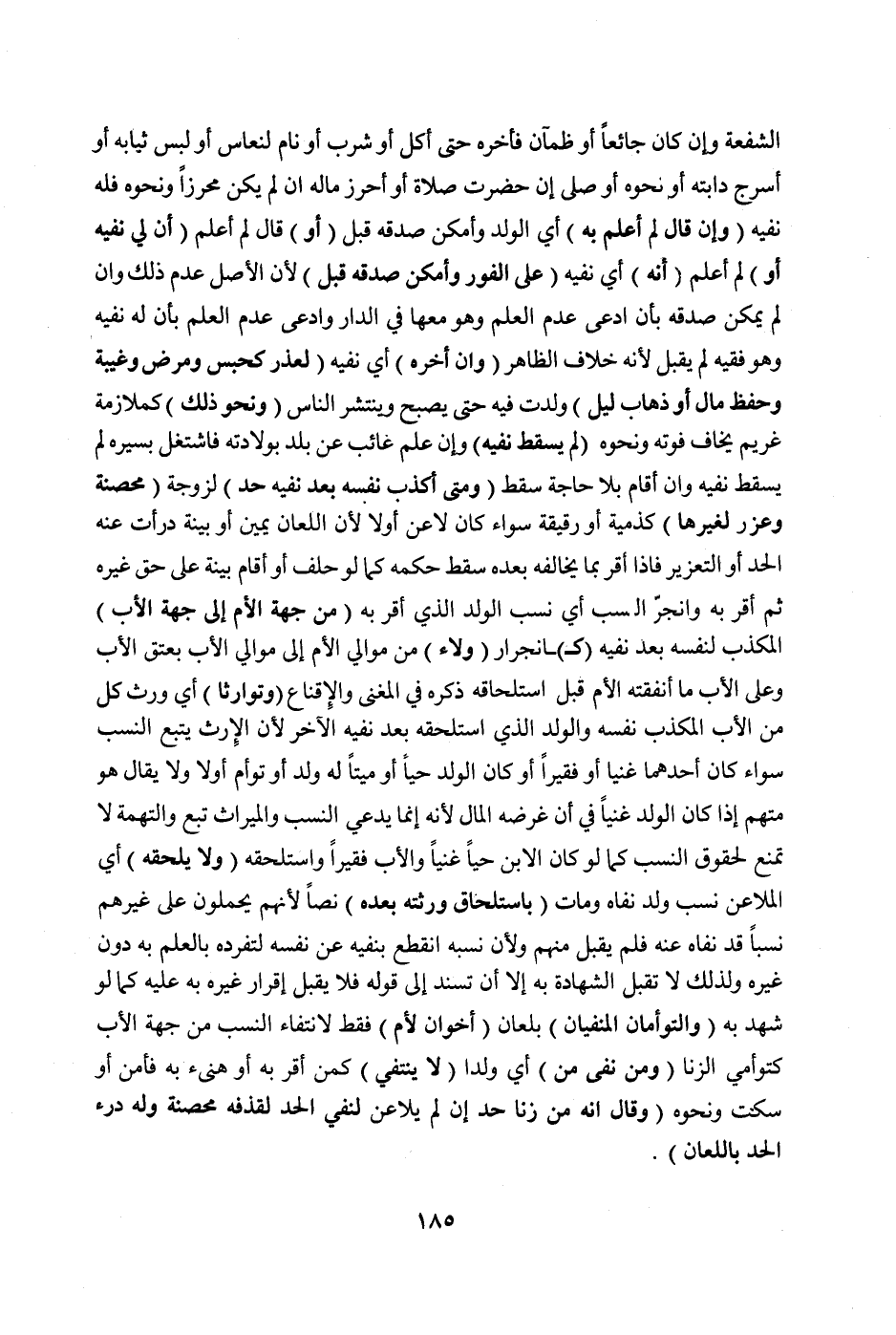 الشُّفْعَةِ وَإِنْ كَانَ جَائِعًا أَوْ ظَمْآنَ فَأَخَّرَهُ حَتَّى أَكَلَ أَوْ شَرِبَ أَوْ نَامَ لِنُعَاسٍ أَوْ لَبِسَ ثِيَابَهُ أَوْ أَسْرَجَ دَابَّتَهُ أَوْ نَحْوَهُ أَوْ صَلَّى إنْ حَضَرَتْ صَلَاةٌ أَوْ أَحْرَزَ مَالَهُ إنْ لَمْ يَكُنْ مُحْرَزًا وَنَحْوَهُ فَلَهُ نَفْيُهُ (وَإِنْ قَالَ لَمْ أَعْلَمْ بِهِ) أَيْ الْوَلَدِ وَأَمْكَنَ صِدْقُهُ قُبِلَ (أَوْ) قَالَ لَمْ أَعْلَمْ (أَنَّ لِي نَفْيَهُ أَوْ) لَمْ أَعْلَمْ (أَنَّهُ) أَيْ نَفْيَهُ (عَلَى الْفَوْرِ وَأَمْكَنَ صِدْقُهُ قُبِلَ) ; لِأَنَّ الْأَصْلَ عَدَمُ ذَلِكَ، وَإِنْ لَمْ يُمْكِنْ صِدْقُهُ بِأَنْ ادَّعَى عَدَمَ الْعِلْمِ وَهُوَ مَعَهَا فِي الدَّارِ وَادَّعَى عَدَمَ الْعِلْمِ بِأَنَّ لَهُ نَفْيَهُ، وَهُوَ فَقِيهٌ لَمْ يُقْبَلْ ; لِأَنَّهُ خِلَافُ الظَّاهِرِ (وَإِنْ أَخَّرَهُ) أَيْ نَفْيَهُ (لِعُذْرٍ كَحَبْسٍ وَمَرَضٍ وَغَيْبَةٍ وَحِفْظِ مَالٍ أَوْ ذَهَابِ لَيْلٍ) وَلَدَتْ فِيهِ حَتَّى يُصْبِحَ وَيَنْتَشِرَ النَّاسُ (وَنَحْوِ ذَلِكَ) كَمُلَازَمَةِ غَرِيمٍ يَخَافُ فَوْتَهُ وَنَحْوِهِ (لَمْ يَسْقُطْ نَفْيُهُ) وَإِنْ عَلِمَ غَائِبٌ عَنْ بَلَدٍ بِوِلَادَتِهِ فَاشْتَغَلَ بِسَيْرِهِ لَمْ يَسْقُطْ نَفْيُهُ وَإِنْ أَقَامَ بِلَا حَاجَةٍ سَقَطَ (وَمَتَى أَكْذَبَ نَفْسَهُ بَعْدَ نَفْيِهِ حُدَّ) لِزَوْجَةٍ (مُحْصَنَةٍ وَعُزِّرَ لِغَيْرِهَا) كَذِمِّيَّةٍ أَوْ رَقِيقَةٍ سَوَاءٌ كَانَ لَاعَنَ أَوْ لَا ; لِأَنَّ اللِّعَانَ يَمِينٌ أَوْ بَيِّنَةٌ دَرَأَتْ عَنْهُ الْحَدَّ أَوْ التَّعْزِيرَ فَإِذَا أَقَرَّ بِمَا يُخَالِفُهُ بَعْدَهُ سَقَطَ حُكْمُهُ كَمَا لَوْ حَلَفَ أَوْ أَقَامَ بَيِّنَةً عَلَى حَقِّ غَيْرِهِ ثُمَّ أَقَرَّ بِهِ وَانْجَرَّ النَّسَبُ أَيْ نَسَبُ الْوَلَدِ الَّذِي أَقَرَّ بِهِ (مِنْ جِهَةِ الْأُمِّ إلَى جِهَةِ الْأَبِ) الْمُكَذِّبِ لِنَفْسِهِ بَعْدَ نَفْيِهِ (كَ) انْجِرَارِ (وَلَاءٍ) مِنْ مَوَالِي الْأُمِّ إلَى مَوَالِي الْأَبِ بِعِتْقِ الْأَبِ وَعَلَى الْأَبِ مَا أَنْفَقَتْهُ الْأُمُّ قَبْلَ اسْتِلْحَاقِهِ ذَكَرَهُ فِي الْمُغْنِي وَالْإِقْنَاعِ (وَتَوَارَثَا) أَيْ وَرِثَ كُلٌّ مِنْ الْأَبِ الْمُكَذِّبِ نَفْسَهُ، وَالْوَلَدِ الَّذِي اسْتَلْحَقَهُ بَعْدَ نَفْيِهِ الْآخَرِ ; لِأَنَّ الْإِرْثَ يَتْبَعُ النَّسَبَ سَوَاءٌ كَانَ أَحَدُهُمَا غَنِيًّا أَوْ فَقِيرًا أَوْ كَانَ الْوَلَدُ حَيًّا أَوْ مَيِّتًا لَهُ وَلَدٌ أَوْ تَوْأَمٌ أَوْ لَا وَلَا يُقَالُ هُوَ مُتَّهَمٌ إذَا كَانَ الْوَلَدُ غَنِيًّا فِي أَنَّ غَرَضَهُ الْمَالُ لِأَنَّهُ إنَّمَا يَدَّعِي النَّسَبَ، وَالْمِيرَاثُ تَبَعٌ وَالتُّهْمَةُ لَا تَمْنَعُ لُحُوقَ النَّسَبِ كَمَا لَوْ كَانَ الِابْنُ حَيًّا غَنِيًّا وَالْأَبُ فَقِيرًا وَاسْتَلْحَقَهُ.