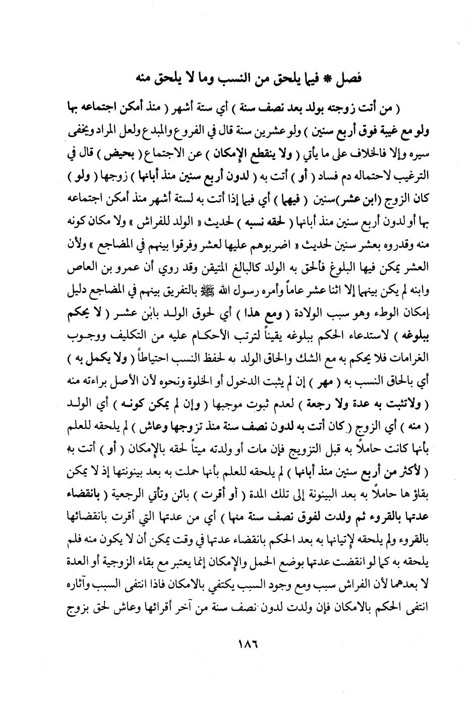(مَنْ أَتَتْ زَوْجَتُهُ بِوَلَدٍ بَعْدَ نِصْفِ سَنَةٍ) أَيْ سِتَّةِ أَشْهُرٍ (مُنْذُ أَمْكَنَ اجْتِمَاعُهُ بِهَا وَلَوْ مَعَ غَيْبَةٍ فَوْقَ أَرْبَعِ سِنِينَ) وَلَوْ عِشْرِينَ سَنَةً قَالَ فِي الْفُرُوعِ وَالْمُبْدِعِ وَلَعَلَّ الْمُرَادَ وَيَخْفَى سَيْرُهُ وَإِلَّا فَالْخِلَافُ عَلَى مَا يَأْتِي (وَلَا يَنْقَطِعُ الْإِمْكَانُ) عَنْ الِاجْتِمَاعِ (بِحَيْضٍ) قَالَ فِي التَّرْغِيبِ لِاحْتِمَالِهِ دَمَ فَسَادٍ (أَوْ) أَتَتْ بِهِ (لِدُونِ أَرْبَعِ سِنِينَ مُنْذُ أَبَانَهَا) زَوْجُهَا (وَلَوْ) كَانَ الزَّوْجُ (ابْنَ عَشْرِ) سِنِينَ (فِيهِمَا) أَيْ فِيمَا إذَا أَتَتْ بِهِ لِسِتَّةِ أَشْهُرٍ مُنْذُ أَمْكَنَ اجْتِمَاعُهُ بِهَا أَوْ لِدُونِ أَرْبَعِ سِنِينَ مُنْذُ أَبَانَهَا (لَحِقَهُ نَسَبُهُ) لِحَدِيثِ (الْوَلَدُ لِلْفِرَاشِ) وَلِإِمْكَانِ كَوْنِهِ مِنْهُ وَقَدَّرُوهُ بِعَشْرِ سِنِينَ لِحَدِيثِ (اضْرِبُوهُمْ عَلَيْهَا لِعَشْرٍ وَفَرِّقُوا بَيْنَهُمْ فِي الْمَضَاجِعِ) وَلِأَنَّ الْعَشْرَ يُمْكِنُ فِيهَا الْبُلُوغُ فَأُلْحِقَ بِهِ الْوَلَدُ كَالْبَالِغِ الْمُتَيَقَّنِ وَقَدْ رُوِيَ أَنَّ عَمْرَو بْنَ الْعَاصِ وَابْنَهُ لَمْ يَكُنْ بَيْنَهُمَا إلَّا اثْنَا عَشَرَ عَامًا وَأَمَرَهُ رَسُولُ اللَّهِ صَلَّى اللَّهُ عَلَيْهِ وَسَلَّمَ بِالتَّفْرِيقِ بَيْنَهُمْ فِي الْمَضَاجِعِ دَلِيلُ إمْكَانِ الْوَطْءِ وَهُوَ سَبَبُ الْوِلَادَةِ (وَمَعَ هَذَا) أَيْ لُحُوقِ الْوَلَدِ بِابْنِ عَشْرٍ (لَا يُحْكَمُ بِبُلُوغِهِ) لِاسْتِدْعَاءِ الْحُكْمِ بِبُلُوغِهِ يَقِينًا لِتَرَتُّبِ الْأَحْكَامِ عَلَيْهِ مِنْ التَّكْلِيفِ وَوُجُوبِ الْغَرَامَاتِ فَلَا يُحْكَمُ بِهِ مَعَ الشَّكِّ، وَإِلْحَاقُ الْوَلَدِ بِهِ لِحِفْظِ النَّسَبِ احْتِيَاطًا. (وَلَا يَكْمُلُ بِهِ) أَيْ بِإِلْحَاقِ النَّسَبِ بِهِ (مَهْرٌ) إنْ لَمْ يَثْبُتْ الدُّخُولُ أَوْ الْخَلْوَةُ وَنَحْوُهُ ; لِأَنَّ الْأَصْلَ بَرَاءَتُهُ مِنْهُ (وَلَا تَثْبُتُ بِهِ عِدَّةٌ وَلَا رَجْعَةٌ) لِعَدَمِ ثُبُوتِ مُوجِبِهَا.