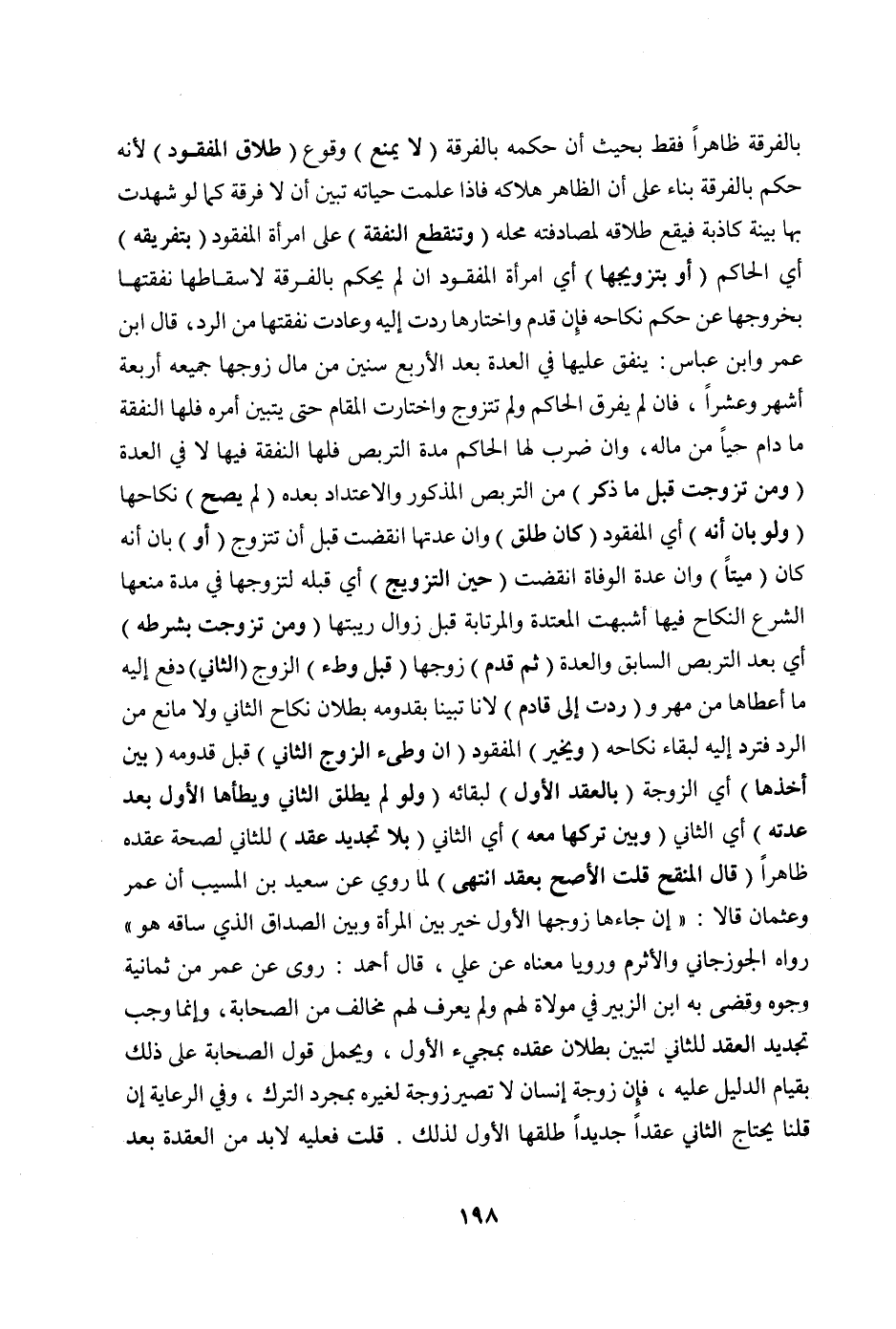 (وَتَنْقَطِعُ النَّفَقَةُ) عَلَى امْرَأَةِ الْمَفْقُودِ (بِتَفْرِيقِهِ) أَيْ الْحَاكِمِ (أَوْ بِتَزْوِيجِهَا) أَيْ امْرَأَةِ الْمَفْقُودِ إنْ لَمْ يَحْكُمْ بِالْفُرْقَةِ لِإِسْقَاطِهَا نَفَقَتَهَا بِخُرُوجِهَا عَنْ حُكْمِ نِكَاحِهِ فَإِنْ قَدِمَ وَاخْتَارَهَا رُدَّتْ إلَيْهِ وَعَادَتْ نَفَقَتُهَا مِنْ الرَّدِّ، قَالَ ابْنُ عُمَرَ وَابْنُ عَبَّاسٍ: يُنْفِقُ عَلَيْهَا فِي الْعِدَّةِ بَعْدَ الْأَرْبَعِ سِنِينَ مِنْ مَالِ زَوْجِهَا جَمِيعَهُ أَرْبَعَةَ أَشْهُرٍ وَعَشْرًا، فَإِنْ لَمْ يُفَرِّقْ الْحَاكِمُ وَلَمْ تَتَزَوَّجْ وَاخْتَارَتْ الْمُقَامَ حَتَّى يَتَبَيَّنَ أَمْرُهُ فَلَهَا النَّفَقَةُ مَا دَامَ حَيًّا مِنْ مَالِهِ، وَإِنْ ضَرَبَ لَهَا الْحَاكِمُ مُدَّةَ التَّرَبُّصِ فَلَهَا النَّفَقَةُ فِيهَا لَا فِي الْعِدَّةِ. (مَنْ تَزَوَّجَتْ قَبْلَ مَا ذُكِرَ) مِنْ التَّرَبُّصِ الْمَذْكُورِ وَالِاعْتِدَادِ بَعْدَهُ (لَمْ يَصِحَّ) نِكَاحُهَا (وَلَوْ بَانَ أَنَّهُ) أَيْ الْمَفْقُودَ (كَانَ طَلَّقَ) وَأَنَّ عِدَّتَهَا انْقَضَتْ قَبْلَ أَنْ تَتَزَوَّجَ (أَوْ) بَانَ أَنَّهُ كَانَ (مَيِّتًا) وَأَنَّ عِدَّةَ الْوَفَاةِ انْقَضَتْ (حِينَ التَّزْوِيجِ) أَيْ قَبْلَهُ لِتَزَوُّجِهَا فِي مُدَّةٍ مَنَعَهَا الشَّرْعُ النِّكَاحَ فِيهَا أَشْبَهَتْ الْمُعْتَدَّةَ وَالْمُرْتَابَةَ قَبْلَ زَوَالِ رِيبَتِهَا (وَمَنْ تَزَوَّجَتْ بِشَرْطِهِ) أَيْ بَعْدَ التَّرَبُّصِ السَّابِقِ وَالْعِدَّةِ (ثُمَّ قَدِمَ) زَوْجُهَا (قَبْلَ وَطْءِ) الزَّوْجِ (الثَّانِي) دَفَعَ إلَيْهِ مَا أَعْطَاهَا مِنْ مَهْرٍ وَ (رُدَّتْ إلَى قَادِمٍ) ; لِأَنَّا تَبَيَّنَّا بِقُدُومِهِ بُطْلَانَ نِكَاحِ الثَّانِي وَلَا مَانِعَ مِنْ الرَّدِّ فَتُرَدُّ إلَيْهِ لِبَقَاءِ نِكَاحِهِ.