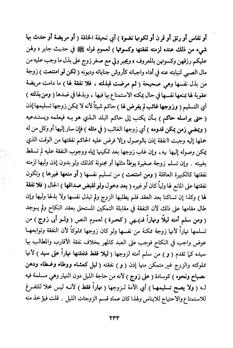 أَوْ نِفَاسٍ أَوْ رَتَقٍ أَوْ قَرَنٍ أَوْ لِكَوْنِهَا نِضْوَةً) أَيْ نَحِيفَةَ الْخِلْقَةِ (أَوْ مَرِيضَةً أَوْ حَدَثَ بِهَا شَيْءٌ مِنْ ذَلِكَ عِنْدَهُ لَزِمَتْهُ نَفَقَتُهَا وَكِسْوَتُهَا) لِعُمُومِ قَوْلِهِ صَلَّى اللَّهُ عَلَيْهِ وَسَلَّمَ فِي حَدِيثِ جَابِرٍ " «وَلَهُنَّ عَلَيْكُمْ رِزْقُهُنَّ وَكِسْوَتُهُنَّ بِالْمَعْرُوفِ» " وَيُجْبَرُ وَلِيٌّ مَعَ صِغَرِ زَوْجٍ عَلَى بَذْلِ مَا وَجَبَ عَلَيْهِ مِنْ مَالِ الصَّبِيِّ لِنِيَابَتِهِ عَنْهُ فِي أَدَاءِ وَاجِبَاتِهِ كَأُرُوشِ جِنَايَاتِهِ وَدُيُونِهِ (لَكِنْ لَوْ امْتَنَعَتْ) زَوْجَةٌ مِنْ بَذْلِ نَفْسِهَا وَهِيَ صَحِيحَةٌ (ثُمَّ مَرِضَتْ فَبَذَلَتْهُ، فَلَا نَفَقَةَ لَهَا) مَا دَامَتْ مَرِيضَةً عُقُوبَةً لَهَا بِمَنْعِهَا نَفْسَهَا فِي حَالٍ يُمْكِنُهُ الِاسْتِمْتَاعُ بِهَا فِيهَا، وَبَذْلِهَا فِي ضِدِّهَا (وَمَنْ بَذَلَتْهُ) أَيْ التَّسْلِيمَ (وَزَوْجُهَا غَائِبٌ لَمْ يَفْرِضْ لَهَا) حَاكِمٌ شَيْئًا ; لِأَنَّهُ لَا يُمْكِنُ زَوْجَهَا تَسْلِيمُهَا إذَنْ (حَتَّى يُرَاسِلَهُ حَاكِمٌ) بِأَنْ يَكْتُبَ إلَى حَاكِمِ الْبَلَدِ الَّذِي هُوَ بِهِ فَيُعْلِمَهُ وَيَسْتَدْعِيَهُ (وَيَمْضِيَ زَمَنٌ يُمْكِنُ قُدُومُهُ) أَيْ زَوْجِهَا الْغَائِبِ (فِي مِثْلِهِ) فَإِنْ سَارَ إلَيْهَا أَوْ وَكَّلَ مَنْ لَهُ حَمْلُهَا إلَيْهِ وَجَبَتْ النَّفَقَةُ إذَنْ بِالْوُصُولِ وَإِلَّا فَرَضَ عَلَيْهِ الْحَاكِمُ نَفَقَتَهَا مِنْ الْوَقْتِ الَّذِي يُمْكِنُ وُصُولُهُ إلَيْهَا فِيهِ، وَإِنْ غَابَ زَوْجُهَا بَعْدَ تَمْكِينِهَا إيَّاهُ وَوُجُوبُ النَّفَقَةِ عَلَيْهِ لَمْ تَسْقُطْ بِغَيْبَتِهِ.
