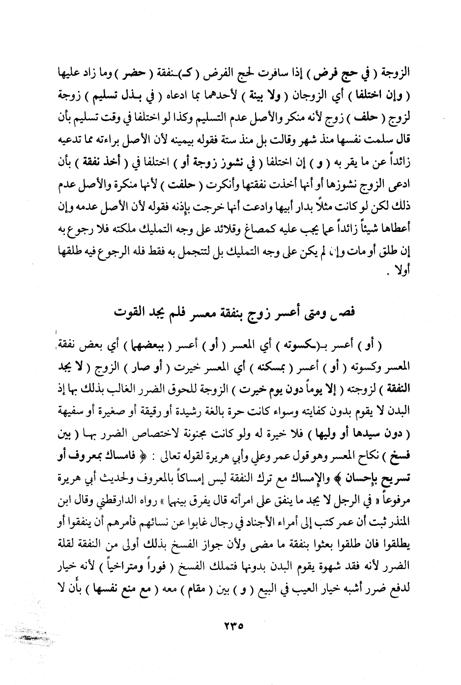 وَمَتَى أَعْسَرَ زَوْجُ بِنَفَقَةِ مُعْسِرٍ فَلَمْ يَجِدْ الْقُوتَ (أَوْ) أَعْسَرَ بِ (كِسْوَتِهِ) أَيْ الْمُعْسِرِ (أَوْ) أَعْسَرَ (بِبَعْضِهِمَا) أَيْ بَعْضِ نَفَقَةِ الْمُعْسِرِ وَكِسْوَتِهِ (أَوْ) أَعْسَرَ (بِمَسْكَنِهِ) أَيْ الْمُعْسِرُ خُيِّرَتْ (أَوْ صَارَ) الزَّوْجُ (لَا يَجِدُ النَّفَقَةَ) لِزَوْجَتِهِ (إلَّا يَوْمًا دُونَ يَوْمٍ خُيِّرَتْ) الزَّوْجَةُ لِلُحُوقِ الضَّرَرِ الْغَالِبِ بِذَلِكَ بِهَا إذْ الْبَدَنُ لَا يَقُومُ بِدُونِ كِفَايَتِهِ وَسَوَاءٌ كَانَتْ حُرَّةً بَالِغَةً رَشِيدَةً أَوْ رَقِيقَةً أَوْ صَغِيرَةً أَوْ سَفِيهَةً (دُونَ سَيِّدِهَا أَوْ وَلِيِّهَا) فَلَا خِيَرَةَ لَهُ وَلَوْ كَانَتْ مَجْنُونَةً لِاخْتِصَاصِ الضَّرَرِ بِهَا (بَيْنَ فَسْخِ) نِكَاحِ الْمُعْسِرِ وَهُوَ قَوْلُ عُمَرَ وَعَلِيٍّ وَأَبِي هُرَيْرَةَ لِقَوْلِهِ تَعَالَى: {فَإِمْسَاكٌ بِمَعْرُوفٍ أَوْ تَسْرِيحٌ بِإِحْسَانٍ} [البقرة: ٢٢٩] وَالْإِمْسَاكُ مَعَ تَرْكِ النَّفَقَةِ لَيْسَ إمْسَاكًا بِالْمَعْرُوفِ وَلِحَدِيثِ أَبِي هُرَيْرَةَ مَرْفُوعًا " «فِي الرَّجُلِ لَا يَجِدُ مَا يُنْفِقُ عَلَى امْرَأَتِهِ قَالَ يُفَرَّقُ بَيْنَهُمَا» " رَوَاهُ الدَّارَقُطْنِيُّ.