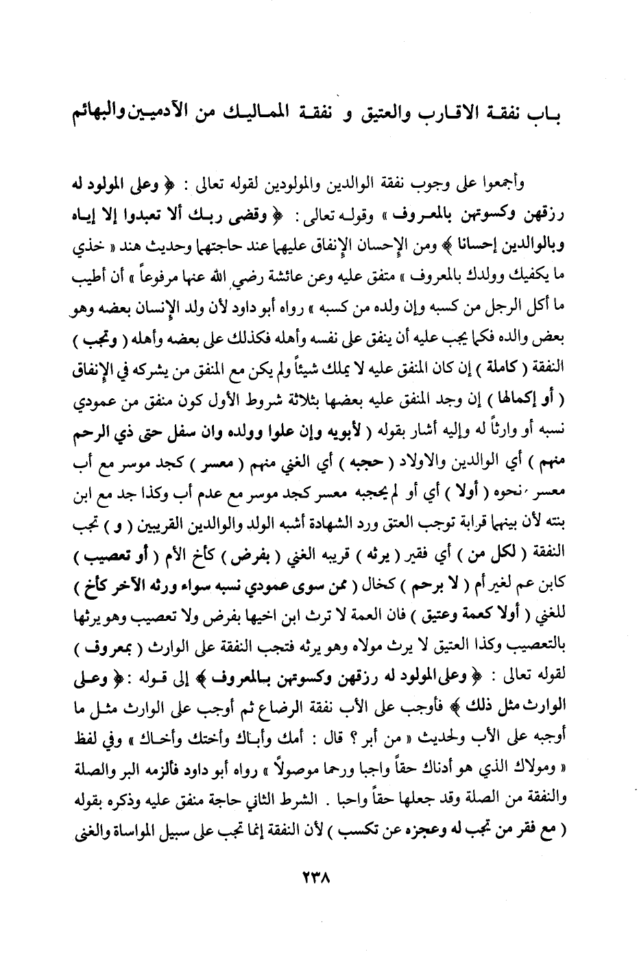نَفَقَةِ الْأَقَارِبِ وَالْعَتِيقِ وَنَفَقَةِ الْمَمَالِيكِ مِنْ الْآدَمِيِّينَ وَالْبَهَائِمِ وَأَجْمَعُوا عَلَى وُجُوبِ نَفَقَةِ الْوَالِدِينَ وَالْمَوْلُودِينَ لِقَوْلِهِ تَعَالَى: {وَعَلَى الْمَوْلُودِ لَهُ رِزْقُهُنَّ وَكِسْوَتُهُنَّ بِالْمَعْرُوفِ} [البقرة: ٢٣٣] وقَوْله تَعَالَى: {وَقَضَى رَبُّكَ أَلَّا تَعْبُدُوا إلَّا إيَّاهُ وَبِالْوَالِدَيْنِ إحْسَانًا} [الإسراء: ٢٣] وَمِنْ الْإِحْسَانِ الْإِنْفَاقُ عَلَيْهِمَا عِنْدَ حَاجَتِهِمَا وَحَدِيثُ هِنْدٍ " «خُذِي مَا يَكْفِيكِ وَوَلَدَكِ بِالْمَعْرُوفِ» " مُتَّفَقٌ عَلَيْهِ.