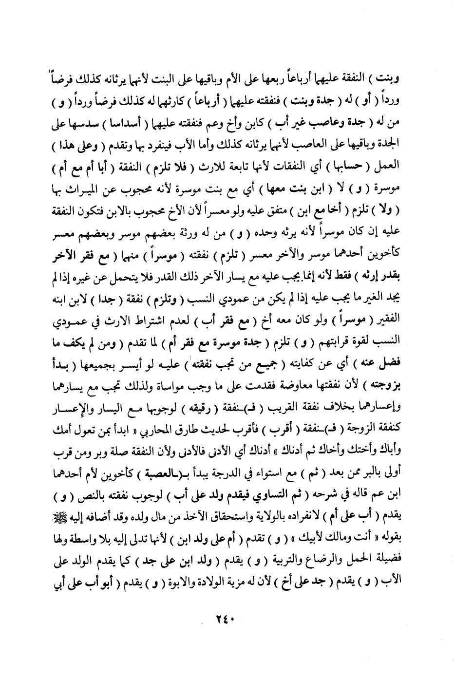 (وَ) تَلْزَمُ (جَدَّةً مُوسِرَةً مَعَ فَقْرِ أُمٍّ) لِمَا تَقَدَّمَ (وَمَنْ لَمْ يَكْفِ مَا فَضَلَ عَنْهُ) أَيْ عَنْ كِفَايَتِهِ (جَمِيعَ مَنْ تَجِبُ نَفَقَتُهُ) عَلَيْهِ لَوْ أَيْسَرَ بِجَمِيعِهَا (بَدَأَ بِزَوْجَتِهِ) ; لِأَنَّ نَفَقَتَهَا مُعَاوَضَةٌ فَقُدِّمَتْ عَلَى مَا وَجَبَ مُوَاسَاةً وَلِذَلِكَ تَجِبُ مَعَ يَسَارِهِمَا وَإِعْسَارِهِمَا بِخِلَافِ نَفَقَةِ الْقَرِيبِ (فَ) نَفَقَةُ (رَقِيقِهِ) لِوُجُوبِهَا مَعَ الْيَسَارِ وَالْإِعْسَارِ كَنَفَقَةِ الزَّوْجَةِ (فَ) نَفَقَةِ (أَقْرَبَ) فَأَقْرَبَ لِحَدِيثِ طَارِقٍ الْمُحَارِبِيِّ " «ابْدَأْ بِمَنْ تَعُولُ أُمَّكَ وَأَبَاكَ وَأُخْتَكَ وَأَخَاكَ ثُمَّ أَدْنَاكَ» " أَدْنَاكَ أَيْ الْأَدْنَى فَالْأَدْنَى وَلِأَنَّ النَّفَقَةَ صِلَةٌ وَبِرٌّ وَمَنْ قَرُبَ أَوْلَى بِالْبِرِّ مِمَّنْ بَعُدَ.